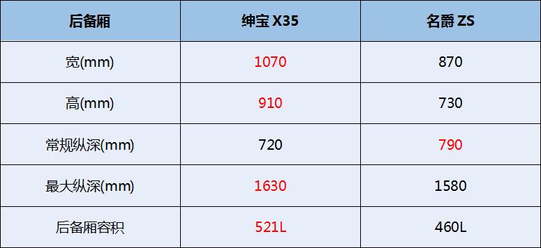 绅宝X35和名爵ZS的储物格空间数量丰富。孩子的零食、水、小玩具等物品可以放在后门板储物格中,放置和拿取都非常方便。 在后备厢尺寸上,绅宝X35和名爵ZS各有优势。而绅宝X35高达521L的后备厢容积,将为出行创造更多可能,宝贝吃的喝的用的玩的可以尽情装,实用性更强。此外,绅宝X35和名爵ZS的后排座椅都能按4/6放倒,瞬间变出一张旅行床,可以在出行中让宝贝休息。可是这两张“床”的大小却不尽相同,绅宝X35多出20cm的宽度,舒适性突出。 |