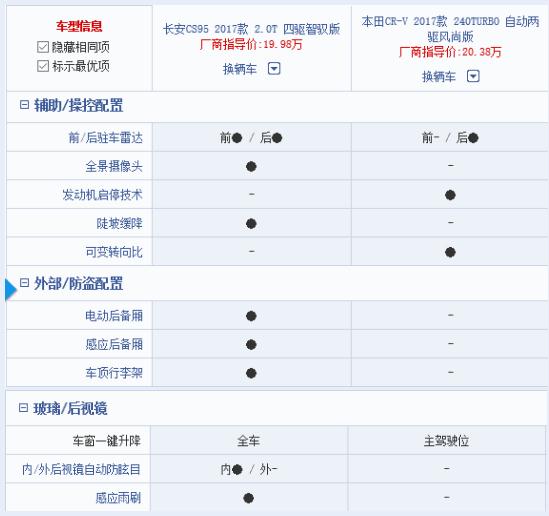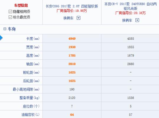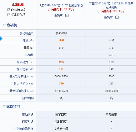 同样20万左右的预算,还在纠结买一辆合资车?还是买一辆性价比更高的国产车?我想,这是在自主品牌集体向上的大环境下,消费者在选择时常遭遇的幸福烦恼。今天,我们就以自主品牌天花板20万级为界,并对比近日刚上市的新款本田CR-V风尚版和长安CS95智驭版,看看究竟应该怎么选? 二胎政策,5座还是7座? 一辆是中大型SUV,一辆是紧凑型SUV,自然在车的空间方面有一定差距。 作为长安推出的一款全尺寸旗舰型SUV,长安CS95拥有4949*1930*1785mm的阔绰车身及2810mm的超长轴距,并在车内贴心设计了38处储物空间,此外,基于人机工程的全局设计,更让每一排都有充足纵向头部空间、腿部空间和横向肩肘臀空间。与二三知己畅谈挥洒,或与家族成员出游,都是不错的选择。 相比7座的长安CS95,作为5座的本田CR-V在空间方面自然要小一些,车身尺寸4585mm*1855mm*1679mm,轴距2660mm。这个数据在紧凑型SUV当中还算具有优势,但遇到搭载人多的情况下就显得不够用了,不过基本日常家用还是可以满足的。 小结:总的来说,这两辆车针对的消费群体有所不同。但站在消费者的角度来看,二胎政策实行带来家庭成员的增加,以及生活品质提高带来的出行需求的增多,都要求私家车拥有更大更舒适的乘坐空间。20万的预算对于家庭人口较多的情况,7座比5座更实用一些。 动力需求,1.5L还是2.0L? 买SUV当然希望它具备一定越野能力,两辆车谁能满足你的用车需求? CS95搭载长安自主研发的蓝鲸2.0TGDI发动机,最大功率171KW(233Ps), 最大扭矩360N·m,百公里加速仅需8.41s,与之匹配的爱信新一代6AT变速器最大可承载450N·m的扭矩,0.8s内即可完成换挡响应;还有博格华纳全新一代NexTrac智能四驱电子控制系统,匹配现代岱莫斯免维护PTU和后桥。黄金动力三剑客的搭配,令CS95拥有优秀的脱困能力,面对复杂路况操控也能畅快如一。 同为20万级的本田CR-V风尚版,拥有i-MMD双电机混合动力系统。其搭载了一台1.5L涡轮增压发动机,最大输出功率142kW(193PS),峰值扭矩243 N·m。传动部分,与之匹配一台CVT无级变速箱和前置两驱系统,百公里加速时间需9.6s。 小结: 从动力参数设置上看,两辆车谁更具有优势可谓一目了然。如今汽车已经不单单是一个代步工具。特别是作为SUV,自然是动力更强,更具备越野能力更为实用。 其他配置,哪个更实在? 所谓一分钱,一分货。定价的差距还体现在配置方面。在这里为了好做对比,我们选取售价水平为同一区间的车型来进行对比,即20.38万的本田CR-V风尚版和19.98万的长安CS95智驭版进行对比。 从图中我们可以看出,同为20万级的两辆车,CS95智驭版比CR-V风尚版多了电动感应后备箱、车顶行李架、内后视镜自动防眩目、感应雨刷等配置;在操控配置上,CS95智驭版匹配的前后车驻车雷达、全景摄像头、陡坡降缓也比CR-V风尚版多出来的发动机启停技术和可变转向比实用的多。 小结:要论配置的丰富性,作为国产品牌的长安确实更胜一筹,再加上CR-V风尚版还要比CS95智驭版售价高4000元,优势一目了然。 看完两车的详细对比,同为20万级别,买谁更有优势,相信各位消费者心中已然有数。作为中国人,看到自家品牌不断进步,心里还是很骄傲的!希望以后能继续给大家带来惊喜。 |