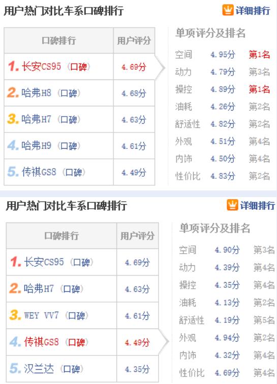 一款车好不好,谁说了算?是厂家一大堆专业名词的忽悠?媒体漫无天际的吹捧?还是一堆“托儿”的一味说好?这些都不算,只有来自车主的真实口碑才最有可信度和参考价值。 传祺GS8一上市就以它“小鲜肉”一样漂亮的外观赢得了很多消费者的喜欢。后续登场的长安CS95在外观上没有GS8惊艳,但也足够稳重大气,以强大的动力性能和优良的配置赢得了越来越多消费者的青睐。可以说两者都是目前国内市场上热门的中大型SUV。 买车不是上街买个菜,10多万元的价格对于大部分家庭来说都是不小的开支。今天,小编就带着大家一起来看看车主们的口碑,也为买车的朋友做一个参考。 综合评分大比拼——谁高谁低,一目了然 从上面两张数据可以看出,CS95以4.69的用户评分,不仅高于GS8还处在热门对比车型的第一名。在单项评分中,CS95在空间、动力、操纵、油耗等七个方面均高于GS8,GS8仅有一个外观在评分上高于CS95。在空间和操纵上,CS95分别以4.95和4.89的高分位于整个热门车型对比的第一名。 从车主的口碑可以看出,CS95综合评分高于GS8,长安CS95的空间、操纵、舒适性等评分都很高,可以看出车主对于长安CS95的认可度很高。传祺GS8的外观也确实不错,但仅以外观好看来支撑一款车,GS8着实不像个“实力派”。对于消费者来说,汽车是用来开的不是用来供养的。 操纵大比拼——哪款车更好开? 在前面的数据中,CS95在操纵上以4.89的成绩高居单项评分榜首,而GS8拿到了4.35分的成绩,差距还是有点明显。关于CS95的操纵性,车友们是这么说的。 @豆dad:操控不错,转向灵敏,速度越快方向盘越沉安全性高,省事。 @湖海青:操控性不错,简单,易上手,转向精确,减震过滤效果不错。 @木仔123:方向盘有点虚位不大,指向精确,方向盘很轻,女孩子操控也轻松,车比较大老婆现在还不敢开,但老大说坐着很舒服。 而传祺GS8的操纵性,车友们就开启了吐槽模式。 @萨美伦商务牛仔:顿挫有点明显。跟车有点不太爽,当你停车以后,前边车走你再起步,这个时候发动机有点虚位,然后好像有人从背后推了你一下。再就是刹车,刹车有点太软,总是感觉刹不住,每次要使劲踩,可使劲踩它的后段又突然发力。搞得自己开车像新手一样,晃晃荡荡。 @随风_Tony:低速时遇到大的起伏,忽忽悠悠的跟开船是的。 @陶先生24:底盘的滤震,遇到一些小颠簸或者小碎石路面,太颠了,真心不舒服。 @昌硕DL招募李广:起步比较肉,还没有电动未门。 @2529778332:操控性一般,减震效果一般,因为我大部分都是在市区跑,方向盘很轻松,但是低速换挡时有顿挫,遇到一些小的坑洞,直接反馈到座椅上了。 总的来说,从用户的口碑看出CS95的操纵性更好,驾驶体验更优越。而传祺GS8就出现了顿挫、颠簸感强等问题。所以说,CS95操控评分高于传祺GS8是有根据的。 油耗大比拼——谁是经济之王? 考虑到后续的用车成本问题,油耗绝对是绕不开的话题。CS95和GS8都属于大中型SUV,本身就不能和一般轿车比油耗,但是两者相比必有胜负,在口碑评分中。CS95的油耗成绩为4.26,而GS8的评分为4.15,在评分上CS95更高一些。长安CS95的用户口碑是这样的。 @ken_zh:现在行驶了将近2500公里,目前油耗9.2这归功于我回了趟她娘家,来回跑了趟高速。这个车,这个油耗,没话说,非常满意! 高速路段表现:我总结如下,仅供参考。定速90,油耗7.6,油耗8.0左右。定速120,油耗9.0左右。 @莂致de疼爱:油耗也很满意,没有像人家说的那么吓人油老虎,对于2.1吨的车子我感觉很不错咯。在市区开开最多也就12个。城郊一般都在10左右。 @hb1982824:平均时速四十多,大部分高速,还有些国道,9.2到9.3徘徊,开空调。 总之,根据CS95口碑油耗来看,CS95在市区驾驶平均油耗在11L/100Km左右,对于一款2吨左右的SUV来说,这个油耗还算正常。与之对比的GS8的油耗,用户口碑是这样的。 @88我爱du:油耗本来期待是10个!可是我的这个15个平均油耗我也是真的不服! @dairyangel:市区低速的油耗有点偏高,堵车严重的情况下要接近一块钱一公里。 @时间追不上的白马:市里油耗有点心疼,油价长得也是肝疼,买得起车,加不起有啊。 @甜妹0916:上下班开开,路况好的话油耗偏高,比如老是吃到红灯阿、堵车阿什么的。 总的来说,用户口碑和评分基本一致,CS95的油耗水平让消费者更能接受,而GS8的油耗被抱怨的多一些。 舒适性——0.63分的差异从何而来? 从表数据可以看出CS95和GS8在舒适性上有0.63分的差异。悬殊还是有点大,同样还是看看用户是怎么说的。 @龙在江湖ABCD:舒适感令人满意,空调制冷效果出奇的好。关键是三区独立控制,大爱啊!对后排的关照完全到位,太符合我的要求了!隔音效果出色。高速低于120km/小时(发动机转速2000转),隔音效果出色,除了风燥,没有其他不正常的声音。 @ken_zh:舒适性总体感觉不错。值这个钱。空调非常给力啊!!跑高速的时候,还会自动把室内循环开成外循环,很爽啊!!而且空调的制冷能力非常惊人。后排有独立空调,真的舒服到爆! @致de疼爱:舒适性不错,感觉很安逸,基本就是像坦克样四平八稳的。静音不得不说,跑到100来码也没有太多的胎噪和风燥,基本和豪车差不多,对于一个7座越野车长安确实用心了。 @yushi1008:过噪音控制100以内非常好,低频噪音处理不是很到位,但是瑕不掩瑜。座椅包裹性很好,软硬适中。 CS95能够拿到4.89在舒适性上的单项高分,用户的口碑已经说明了一切。而传祺GS8在舒适性上得分偏低,