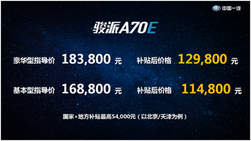 9月22日,天津一汽首款纯电动车骏派A70E在天津中新生态城正式上市。新车共推出两款车型,豪华型的指导价格为183,800元,基本型的指导价为168,800元,以北京天津为例,补贴后售价分别为129,800元和114,800元。作为天津一汽‘’骏驰计划‘’在新能源领域的重磅落子,骏派A70E凭借其高效节能、驾乘舒适和360°安全为消费者打造出了一款全新一代动·感座驾。 骏派A70E价格 本次发布会从主题到现场布置,处处体现了绿色和科技的元素,这也与新能源车所要表达的环保理念一致。天津一汽汽车销售有限公司总经理黄春明在开场致辞中表示,面对新能源市场从政策导向向需求导向过渡的现状,天津一汽有信心在技术创新方面引领主流,同时也有责任在节能减排方面积极作为。