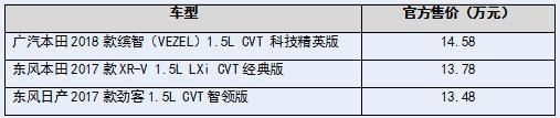 目前中国市场上最火爆的小型SUV当属“本田双子星”缤智(VEZEL)和XR-V。尤其是近期正式上市的广汽本田2018款缤智(VEZEL),新增1.5L CVT 科技精英版,搭载了许多以往只在1.8L车型上才有的人性化科技配置,价值魅力全面提升。 2018款缤智(VEZEL)上市 “本田双子星”自然实力不在话下,但近期刚上市的东风日产劲客也表现不俗。合资小型SUV到底怎么选? 下面笔者选取三款车型代表各自车系高性价比的版本进行对比,它们分别是2018款缤智(VEZEL)1.5L CVT 科技精英版、2017款XR-V 1.5L LXi CVT经典版和2017款劲客1.5L CVT智领版。(以下统一简称:缤智科技精英版、XR-V经典版、劲客智领版) 外观内饰对比:缤智更精致,劲客更个性 缤智(VEZEL)科技精英版外观设计依然从“Dynamic Cross Solid”理念出发,先锐灵动的外观、钻石般多变的车身、特立独行的双腰线、灵动大气的车尾、隐藏式后门外把手、晶钻LED前大灯+光纤式LED尾灯设计、令缤智(VEZEL)更显精悍的车顶行李架;内饰方面,中控台大胆的撞色设计、独特的悬浮式双色仪表盘、简洁醒目的浮雕式转速针打造的飞行驾驶舱和航空式梦幻坐舱、宽幅式空调出风口——极为精致的外观内饰,散发出浓郁先锋艺术气息,同时透露了一个声音:这是一辆全面满足新生代年轻消费族群需求的“先锋派座驾”。 缤智1.5L科技精英版 而作为东风本田的首款小型SUV,XR-V经典版外观设计借鉴了“老大哥”CR-V的风格,拥有时尚动感的外观设计和炫酷的驾乘坐舱。其与全球车型——缤智(VEZEL)相比做工稍逊,但外观内饰整体风格类似,优势在于其拥有一体式LED后尾灯和涡轮式空调出风口这两项独特的设计。 XR-V经典版 劲客智领版追求劲酷运动的造型,拥有时尚拼色车身、悬浮式车顶,较前两者更为年轻个性。新车采用的全新内饰设计既简洁又大方,但中控台大量使用了硬塑料,用料做工较为一般。 劲客智领版 小结:对于外观内饰,虽然每个人审美标准不一样,但还是可以看出三款车型中,劲客最为个性,这也导致审美标准过于小众,目标受众面相对偏窄;缤智(VEZEL)和XR-V年轻时尚的造型设计会更让大众消费者接受,尤其是做工和质感方面更为精致的缤智(VEZEL),更容易在试乘试驾后给消费者带来好感。 空间尺寸对比:旗鼓相当 缤智(VEZEL)科技精英版的长宽高为4294×1772×1605mm,轴距为2610mm,其车宽和车高占据优势,其后备箱空间为437L,放倒后排的情况下空间可扩大至1456L,可谓小SUV有大空间。此外,缤智(VEZEL)配备后排6:4分体式可倾斜/翻转的折叠座椅,空间灵活多变,可适应各种乘驾情景。 XR-V经典版的车长较缤智(VEZEL)短24mm,而宽、高和轴距的数据都与前者一致。东风本田并未公布其后备箱数据,据权威媒体实测其内部驾乘空间和储物空间与缤智相当,也同样支持后排座椅魔术收纳。 劲客智领版的车长和轴距较前两者更占优势,而其后备箱空间为428L,较缤智(VEZEL)略小,不过后排也支持按6:4的比例放倒,空间利用率同样很高。 小结:三款车的车身尺寸可谓旗鼓相当,缤智(VEZEL)和XR-V车身更宽更高、后备箱空间更大;而劲客车身和轴距更长。三款车的实际空间表现相差不大。 动力系统对比:Honda黑科技VS Nissan买菜车 动力方面,缤智(VEZEL)科技精英版以 “Smart&Active”为动力性能设计理念,搭载了Honda独创“地球梦科技”动力总成——高效能的1.5L i-VTEC发动机辅以轻快顺畅的新一代CVT变速器,带来最大功率96KW、155N?m峰值扭矩。缤智(VEZEL)1.5L自然吸气发动机动力表现全面领先同排量车型,该款发动机在DOHC、VTEC技术基础上搭载VTC(智能可变气门正时及升程控制系统中的智能点火正时控制机构),并应用阿特金森循环和燃料直喷技术,降低摩擦并大幅提高燃烧效率。在释放强劲动力的同时,百公里综合油耗低至5.9L。 地球梦科技1.5L发动机 XR-V经典版同样搭载了地球梦科技1.5L发动机,虽然与缤智(VEZEL)的发动机型号略有不同,但实际的动力输出表现完全一样。不过有一点比较遗憾的是,根据东风本田的官方资料显示,这款XR-V的排放标准是国Ⅳ和国Ⅴ,而缤智(VEZEL)全系车型均满足国Ⅴ排放标准。 劲客智领版搭载1.5L自然吸气发动机,最大功率91kW,峰值扭矩147Nm。传动方面,匹配的也是CVT变速箱。而这款车的百公里油耗低至5.6L,不过动力输出表现相比本田的两款车型略逊一筹。 小结:Honda 1.5L地球梦发动机动力输出强劲且兼顾环保省油,是新生代年轻消费族群的不二选择;东风日产劲客的1.5L发动机调教偏省油但动力也更弱,似乎与其所定位的年轻人群追求运动的属性不太匹配,反而更适合以“买菜车”为诉求的家庭主妇。 车型配置对比:科技型VS入门型VS水土不服型 缤智(VEZEL)科技精英版新增了许多以往只在1.8L车型上搭载的实用科技配置,实现更高的性价比。缤智(VEZEL)科技精英版采用晶钻LED前大灯+光纤式LED尾灯设计,更具潮流魅力;新增的车顶行李架则使缤智(VEZEL)科技精英版更精悍;外后视镜电动折叠提高了便利性;真皮多功能方向盘不仅使驾控更加便捷,也倍增了豪华感。智能科技配置方面,新增Smart Entry智能无匙进入系统以及一键式启动功能,同时搭载定速巡航功能,让驾驶者充分享受智能科技所带来的便捷生活。此外,缤智(VEZEL)科技精英版还搭载了倒车影像、电子驻车自动驻车、车内空气过滤器等对于安全和健康极其重要的科技配置。 缤智1.5L科技精英版部分科技配置 XR-V经典版是三款车型中配置较