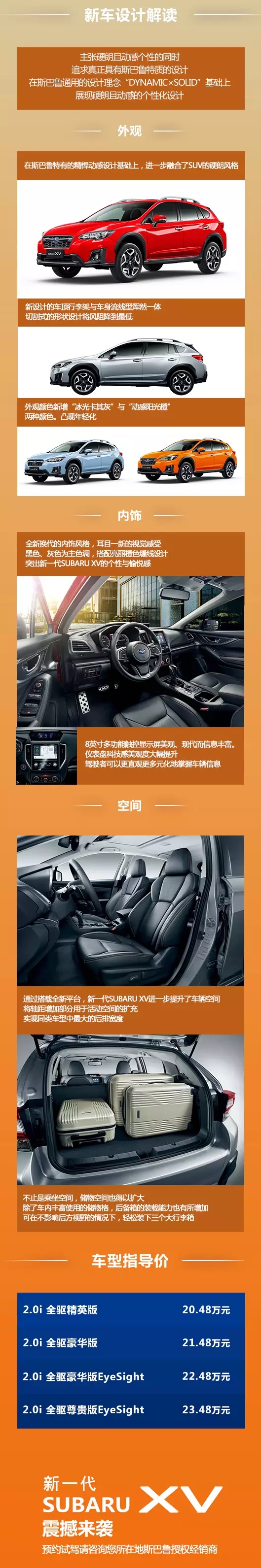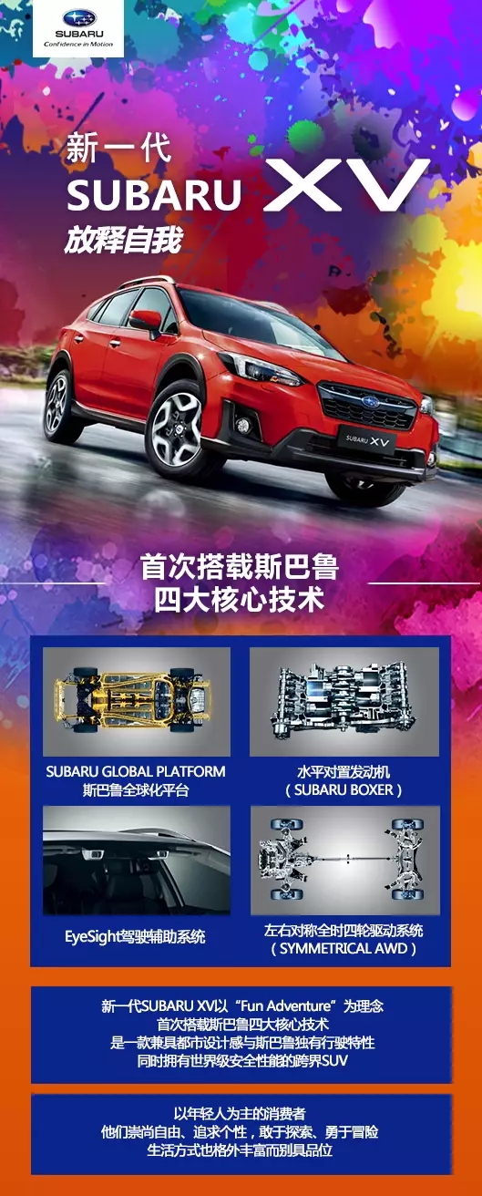 新一代SUBARU XV将于10月8号亮相于斯巴鲁石家庄鑫山店,匠心之车,邀您品鉴!到店更有惊喜品鉴好礼,数量有限,先到先得。 动感时尚、极具个性魅力又能满足城市生活多元化需求的SUBARU XV,对于那些崇尚自由、追求个性、勇于探索与冒险、生活方式也格外丰富且别具品位的年轻人来说,有着与生俱来的吸引力。 在中国市场上首款汇聚水平对置发动机(SUBARU BOXER)、左右对称全时四轮驱动系统(Symmetrical AWD)、斯巴鲁全球化平台(SUBARU GLOBAL PLATFORM)、EyeSight驾驶辅助系统四项核心汽车技术的车型,将继续以时尚个性的风格、强大的行驶性能、世界级安全性能的高度融合而征服年轻消费者之心。 从影像到真实 我们等你来 石家庄斯巴鲁 诚邀您参加新一代 SubaruXV 上市发布会 活动时间:10月8日 19:00开始 品鉴热线:0311-87753876 活动地点:石家庄市北二环东路86号 鑫山斯巴鲁店内 新一代SUBARU XV除了更年轻化的外观及更精致的内饰风格之外,新车还是首款汇聚了斯巴鲁四大核心技术(水平对置发动机、左右对称全时四轮驱动系统、EyeSight驾驶辅助系统、斯巴鲁全球化平台)于一身的车型。欲知更多新车信息?点开长图,了解新一代SUBARU XV。 点击图片可放大观看 |