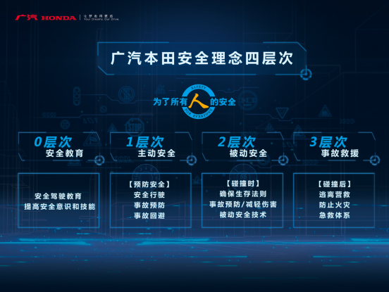 广汽本田于2007年正式发布了 “为了所有人的安全”企业安全理念,突出在交通社会中“人”的重要性,并将汽车安全的关注重心由驾驶员覆盖到乘员与行人。这一安全理念包含四个层次,即0层次的安全教育、1层次的预防安全(主动安全)、2层次的碰撞安全(被动安全)和3层次的事故救助。