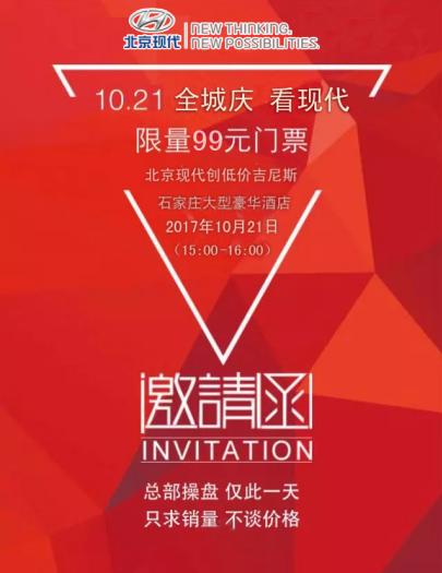 【总部操盘 只要销量 不谈价格】 北京现代15周年厂庆直销会石家庄站 只要销量,不谈价格!究竟谁家这么财大气粗? 一年一次,便宜到家,是真的吗? 原来是北京现代厂庆直销会,知道内情的我感激涕零,多亏没在十一买! 但我估计那一天可能会这样 这样 这样 所以我决定这样,这样,这样!全服武装,(10.21日)周六出发! 10.21日北京现代15周年厂庆直销会 ▼总部操盘▼ ▼只要销量▼ ▼不谈价格▼ 买现代找我们更划算!!! 亲爱的朋友们,想用最低价格买到您心仪的北京现代爱车吗?来找我们就对了,北京现代本次活动“意向金”名额,抢到你就赚翻啦!内购价、特价车、各种折扣优惠,更有千元家电循环大抽奖!北京现代工厂直销节,总部价格直降,一年仅此一次,全系金融补贴高达3年免息!速速打电话报名吧!0311-85618878 意向金99元,有啥特权? 1可获得活动入场券一张(活动需凭券入场) 2凭意向金劵可领千元购车红包一个(仅限当天订购车使用) 3提前交付意向金99元可在活动价格基础上抵新车交强险 终极大奖一吨油等您带回家! |