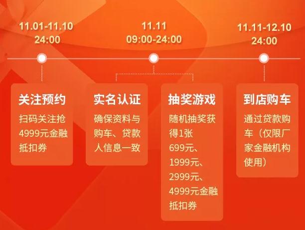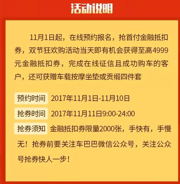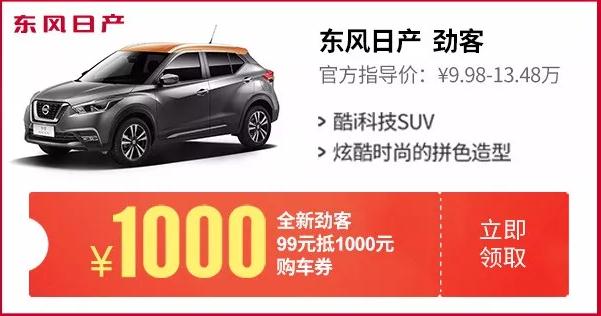 上市仅三个月的全新劲客突破万台销售大关 不仅如此 在掏空身体的11.11双节狂欢购上 劲客与蓝鸟一起再搞事情! 我们不怕事儿大,就怕事儿不够大! 搞事情?对! 只要你满足两个条件 就能在 11.11占到东风日产最大的便宜! 1、购车预算是10万左右的SUV或家轿, 而劲客或者蓝鸟又正好是你的目标之一; 2、你乐意享受分期购车的方式; 然后你需要完成下面两个步骤: 即日起至11月12日 到车巴巴疯狂购活动页 预付99元领取1000劲客/蓝鸟专属购车券 (这个购车券无论你是全款购车还是分期购车都可以使用) ps.放心,无论你最后是否购车, 这预收的99元订金都会原路退回给您哦。 值得你疯狂打call!东风日产11.11购车至高优惠4999元 当然了,如果劲客和蓝鸟 不是你的目标车型也没所谓, 你也是可以用抽到的 4999元金融抵扣券来购买其他车型的, 不过提醒一下,并不是每个人都可以 获得4999元金融抵扣券的哦, 至于你能拿到多少, 真的是看你的人品有多好了。 (抵扣券面额分别有499元、1999元、2999元、3999元、4999元) 再友情提示一下, 完成在线分期购车的话, 还有机会获得一份神秘大礼哦。 |