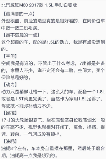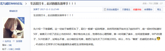 点开一篇微信文章,会直接下拉到评论区的小伙伴,请举手! 我们为什么爱看评论区?除了这里充斥着“知乎大神”和各路“神回复”之外,最重要的原因就是它的“真实参考性”。 好比我们想知道一家餐馆是否好吃,在大众点评上浏览评论区是最快捷、最精准的办法。如果我们想买车,多看看口碑评分和论坛贴,无疑比看某些评测文章更有用。口碑和论坛就像民间奖项一样,凡是响应良好的车辆,无论品质还是保值率,都不会让你失望。 近日,在来自权威汽车媒体的口碑排行榜中,北汽威旺M60以4.75分的高分,摘得同类车型的口碑榜首。同时,源于其“SUV+MPV”跨界车的特性,也让威旺M60在空间、舒适性、外观、性价比等多项细分评比中,赢得头名。 如果单论品牌力,北汽威旺与榜单中的比亚迪-宋MAX和宝骏730等车型,都有一定的差距。更何况威旺M60作为一款跨界车,远没有传统MPV让人熟悉,为何TA能摘得口碑桂冠呢?话不多说,有图有真相。 Jimren:外观炫酷,七座空间有保障 liqican520:1.5T动力强,座椅舒适 随心W而动:内饰科技感强,性价比高 从部分车主的口碑中,我们可以看出威旺M60是一款特点鲜明的跨界车,几乎所有车主,选车时最初的原因都集中在“颜值“和“空间”两大类。同时,许多车主都提到车辆内在的科技感,的确,包含了语音交互、车载WIFI、行车记录仪、远程定位及防盗的Welife系统,是吸引不少年轻车主的一大利器。 虽然产品备受好评,但威旺M60的跨界车身份,是优势也是劣势。毕竟有不少出色的产品,最终都被埋没在“小众”这个词里了。好在威旺M60活跃的论坛向我们证明,“跨界”概念,已经被越来越的人所接受。 进入威旺M60的论坛,除了我们想象中众多的车友交流和新车美图之外,最让我关注的就是论坛内丰富的活动公告了。从10月份开始到现在,几乎每个周末,威旺论坛都会组织各类活动,其中声势最大的,就是本月刚刚结束的Welife生活馆。 据了解,由厂商主办的Welife生活馆,成为了威旺车主周末的聚集地,逛街,带娃,试驾,买车,在生活馆中都能满足。可见,威旺不止让车玩儿跨界,更让TA的车主,都能在周末玩儿high。 可见,如果选择了叫好又叫卖的威旺M60,你能得到的或许不止一台口碑好车这么简单。活跃的论坛交流,丰富的车友活动,都能为每一个车主,创造丰富的车生活,说不定你人生中最重要的小姐姐,也在其中呢? |