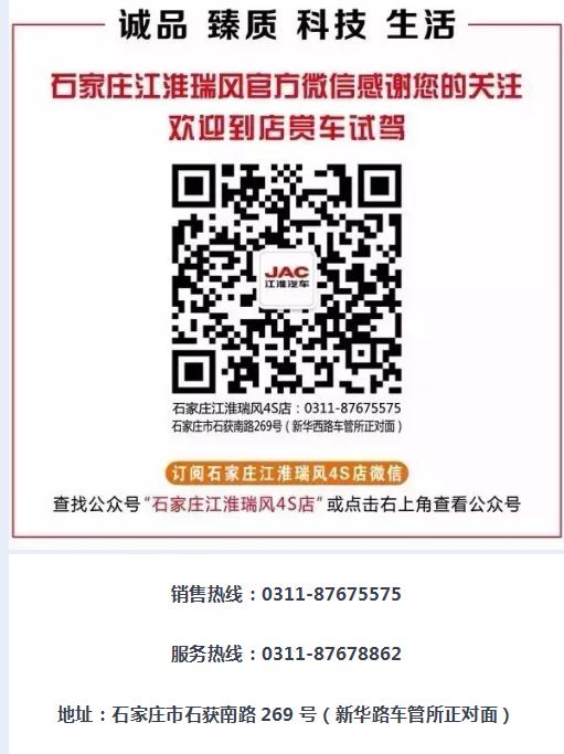 重磅! 重磅! 重磅! “税末焕新 年终盛典” 双12特价周 台台特价 等你来嗨!! 超值优惠惠不可挡! 绝不忽悠!绝对震撼!不怕吃亏不怕上当! 特价热线0311-87675575 绝对为您省钱到手软 ※品质提升 实惠到底:瑞风S7 用智慧和能力,为“中国造”代言! 见证属于江淮汽车智能制造的非凡时刻! 综合优惠2万元! 现已接受预定! 2017年12月7日~12日 桥西区石获南路269号车管一所正对面 石家庄江瑞店 邀您提前引爆双十二低价潮! 扫描上方二维码,加入瑞风S7购车交流群,抱团购车有优惠哦 销售热线:0311-87675575 服务热线:0311-87678862 地址:石家庄市石获南路269号(新华路车管所正对面) |