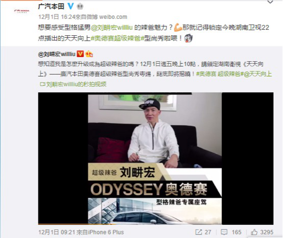 12月1日,奥德赛(ODYSSEY)超级辣爸型尚秀专场在湖南卫视《天天向上》播出,明星辣爸、模特辣爸、跑酷辣爸同台竞技,逗趣演绎带娃环节、积极共享带娃辣招,为众粉带来了一次火花四溅、爆笑十足的辣招比拼之旅。集颜值、品位、才智于一身的全享型座驾奥德赛(ODYSSEY),则全程为辣爸们的睿智精彩表现打call。 辣爸郭京飞登场 辣爸吴尊登场 辣爸刘畊宏登场 奥德赛型格辣爸决位赛搬上《天天向上》舞台,引爆时尚辣爸话题热潮 何谓“辣爸”?颜值辣?身材辣?态度辣?型格美男吴尊、型格猛男刘畊宏和型格酷男郭京飞现身奥德赛(ODYSSEY)《天天向上》超级辣爸专场,生动诠释他们对于“辣爸”内涵的理解。身为型格辣爸,不仅要颜值满分,更拥有健康的体魄与无敌超人神力,才能给予孩子十足的安全感。三位明星辣爸在节目设置的“拼神力”环节,不仅展现了长期锻炼的成果,引发现场高分贝粉丝“尖叫”,更认真分享了长期锻炼的心得与感受,满满正能量夺屏而出。 辣爸座驾登场 三位辣爸谈初当爸爸感受 除了三位明星辣爸之外,主持人汪涵同样也是一位观点睿智、“女儿奴”属性爆棚的辣爸,他们开心畅谈,从爸爸身份为自己人生带来的正面转变,到挑选亲子出游座驾最注重安全性与大空间,不同风格辣爸之间思维的碰撞,金句不断,话题既引人深思又接地气。被誉为辣爸出行最佳装备的奥德赛(ODYSSEY)多次出现在嘉宾话题里。作为奥德赛(ODYSSEY)老车主的郭京飞,在荧屏前对这款宜商宜家,全享型MPV满意之情溢于言表。“我们家第一台车就是奥德赛(ODYSSEY),选择它不仅因为大7座功能的实用性,更因为它后排空间非常适合给孩子安装安全座椅,全家出行既能有安全感又不牺牲舒适感。” 刘畊宏聊辣爸出行方式 郭京飞对奥德赛的印象 随着《天天向上》辣爸型尚秀节目播出,关于辣爸型格的话题再度被炒热,奥德赛(ODYSSEY)与明星辣爸一起,成功收获关注。 明星辣爸@广汽本田官方微博互动截图 辣爸专属座驾形象再提升 奥德赛打响品位营销年底收官战 近年,国内MPV市场尚处于成长培育阶段,不少MPV车型仍聚焦强调产品优势,而奥德赛(ODYSSEY)以品位营销沟通为策略,与多档时下热门栏目合作,持续激发目标受众共鸣,塑造出区隔于竞品“单纯强调产品功能性”的差异化品牌竞争力,并取得不错的市场效果。 某位奥德赛(ODYSSEY)资深媒体车主表示:“作为汽车媒体,又是多年的奥德赛(ODYSSEY)车主,这些年我看到在多数MPV车型仍在强调‘七座、居家、商务’等产品力的时候,奥德赛(ODYSSEY)能率先摸准目标受众调性,用走心又走巧的营销方式与消费者建立情感联系。无论是此前的非凡品鉴会,还是这次的《天天向上》辣爸营销,都可以看到奥德赛(ODYSSEY)在培育MPV消费群,圈粉中年男性阶层所下的功夫,我想这也是奥德赛(ODYSSEY)品位营销的独到之处。” 去年10月,奥德赛(ODYSSEY)与综艺大咖马东的网络综艺节目《饭局的诱惑》合作,产品年轻化形象在年轻目标受众中实现精准曝光及渗透。今年,奥德赛(ODYSSEY)携手国内最具影响力之一的湖南卫视,通过与其金牌娱乐节目《天天向上》深度合作,更直观、生动地向受众演绎出奥德赛(ODYSSEY)倡导的辣爸型尚生活态度与价值品位主张,成功打响了广汽本田分车型定制营销的年底收官战。 观看现场录制的某媒体表示:“奥德赛(ODYSSEY)进入中国市场已有15年了,历经3代,始终保持时尚有型的气质,正如我们这种不希望被贴上‘油腻’便签的中年人,既要稳重可靠,又要保持对外界事物积极探索、敢于拼搏的精神,才能在事业与家庭两种模式下自如切换,这是我认为辣爸应该要有的态度。” 展现超级进化的科技之美,全享型MVP奥德赛型格炼成记 正如上文媒体所述,奥德赛(ODYSSEY)是最早引进中国的MPV品牌之一。2014年,第五代奥德赛(ODYSSEY)上市,逐步树立起国内MPV市场全新价值标杆,开启国内市场MPV全享时代,成为注重商务居家性能消费者的首选车型。 新锐外观方面,第五代奥德赛(ODYSSEY)以具有冲击力的“Solid Streamline”为外观设计理念,豪华大气的专属运动大包围、动感活力的专有前格栅以及时尚与实用兼具的镀铬前雾灯,传递出“MPV也能运动”的全新潮流气息;在空间上的升级则无不彰显产品顾家体贴的另一面,营造的全享空间配上细腻材质,第二排航空座椅、双侧电动滑动门和超低地台设计,为乘车与载物注入科技人性化元素。 有颜值,有关怀,更有实力,这才配得上辣爸专属座驾的头衔。搭载地球梦科技动力总成,配上无级变速、Idle-stop发动机节能自动启停系统,实现奥德赛(ODYSSEY)综合工况油耗低至7.8L/100km。 MVC 360°全景影像系统 科技保障安全,奥德赛(ODYSSEY)还拥有MVC 360°全景影像系统、PA自动泊车辅助系统、BSI盲区监测系统、CTM后视动态提醒系统、DWS胎压监测系统等科技智能配置,实现辣爸出行安驾之旅。同时,考虑到老年人、特殊群体等用户群体的出行需求,2016年广汽本田推出全新派生车型奥德赛(ODYSSEY)福祉车,助力更多人群实现“无障碍、有尊严地自由出行”的梦想。 作为国内MPV市场的价值标杆车型,奥德赛(ODYSSEY)不仅商务与顾家兼备,且经济实用不失优异性能,在以“辣爸”为主题的品位营销助力下,产品特质将得到进一步释放,也将成为更多时尚、顾家都市精英人士实现工作、生活自如切换梦想的用车之选。 广汽本田汽车销售有限公司 2017年12月2
