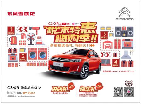 又到了一年的年终,是时候好好犒劳自己了。礼物季各种铺天盖地的礼物清单不是送给男朋友就是送给女朋友,却忘了也得给辛苦了一年的自己准备一份年终礼物。虽然在吃土的路上一去不复返,但年末也是一个充满仪式感的剁手的好借口,而且年末各种优惠豪礼不要太!划!算! 东风雪铁龙C3-XR早已谙熟年轻人的购物心机,携手国美开展“税”末特惠嗨购季活动,在2017年12月16日-2018年1月14日登陆上海、苏州、无锡、合肥、昆明、贵阳、厦门等全国21个城市,带来一大波购车豪礼,一起来看看有没有你的菜…… 超人气进店礼 进店扫码点击立即领取,下载、注册国美APP后,即可获得东风雪铁龙与国美精心准备的超人气购物礼券。不仅有价值800元的微软制定型号无门槛礼券,更有像素高达2000万柔光双摄的某手机品牌的160元心动抵用券等等。 还在说吃鸡没有好装备,拍照没有好像素?是时候改变一下这种窘状,赶快到东风雪铁龙活动门店扫码领取礼券,年底愉快地买买买,好好地犒劳自己。 重磅购车豪礼 进店下定金购买C3-XR,即有机会赢取300-4999元的国美美通卡,可以在国美商城进行购物。但是到底可以买些什么呢?各类家电任由你想,终于可以给新家添置一些“硬货”了,电视、冰箱、洗衣机、微波炉….. 你以为只有这些吗?错错错!还有价值1280元的炫动后包围精品配件,让你的车一酷到底! 除了礼品,相信你对车也需要有一定的了解~