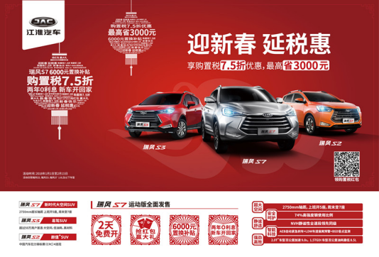 江淮岁末现金补贴用户,入手瑞风SUV购置税7.5折优惠 国家小排量燃油车购置税优惠政策从2018年1月1日起正式取消,恢复为10%的税率征收,这意味着今年购车要比去年多付2.5%的购置税。在国家政策调整之际,江淮乘用车倾情推出“迎新春,延税惠”瑞风SUV购置税补贴活动,为有意购买瑞风SUV的用户带来最实在的优惠。 美味糕点、趣味互动,在江淮度过一个惬意而舒适的下午 从即日起至2月15日除夕,购买瑞风S7、瑞风S3和瑞风S2等瑞风SUV系列产品1.6L及以下车型就可以享受江淮乘用车送出的购置税7.5折优惠大礼,最高购置税现金补贴金额高达3000元。本次瑞风SUV购置税补贴政策,一方面是江淮积极贯彻“敬客经营”价值理念的结果,直接降低用户的购车成本,另一方面是为了让江淮乘用车的优秀产品能够以最高的性价比优势深入用户圈层,进一步提升江淮的产品口碑和品牌形象。 随着汽车市场的快速发展,SUV市场竞争越发激烈,而激烈竞争的背后实质上是消费者需求的进一步深化。江淮能够倾听新时代消费者需求,应时推出全新瑞风S7运动版,不仅践行了敬客经营的理念,也展现了江淮高效的创新执行力。此外,瑞风S7旗舰型的发售,让消费者智能辅助驾驶的梦想触手可及。随着运动版的上市和旗舰型的发售,瑞风S7产品系谱也得到进一步完善升级,为江淮在消费升级型市场竞争增加砝码。 更多信息请咨询经销商: 经销商:河北君天江淮汽车4S店 销售热线:0311-66069000 服务热线:0311-66069966 公司地址:石家庄市北二环东路86号国际汽车贸易园区内 经销商:石家庄江淮瑞风汽车销售有限公司 销售热线:0311-87675575 服务热线:0311-87678862 地址:石家庄市石获南路269号(新华路车管所正对面) |