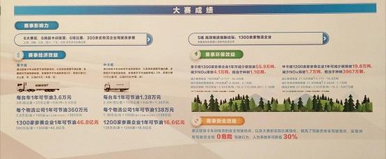 2018年1月17-18日,在历时半年,历经上海、河南、山东、四川、广东五站分站赛之后,“福田戴姆勒杯”2017中国高效物流卡车公开赛北京站总决赛顺利举行。来自交通运输部、中国交通报社、福田汽车集团、福田戴姆勒汽车等政府与企业的相关领导、参赛物流企业及赛手、重点经销商、新闻媒体代表200多人莅临现场,共同见证2017中国高效物流卡车公开赛年度总冠军的诞生与践行降本增效全国十强明星物流企业的出炉,见证中国高效物流卡车公开赛总决赛完美收官。2017中国高效物流卡车公开赛直面高效物流发展难题,以大赛为核心为用户提供降本增效的“欧曼方案”,取得了良好的经济效益和社会效益。 【2017中国高效物流卡车公开赛(总决赛)开赛仪式】 【交通运输部总工程师周伟先生莅临2017中国高效物流卡车公开赛总决赛】 赛为实用 降本增效成效显著 为落实国务院《关于进一步推进物流降本增效促进实体经济发展的意见》,部署推进物流降本增效提升物流业发展水平,促进实体经济发展;响应交通运输部《关于推进供给侧结构性改革 促进物流业“降本增效”的若干意见》,切实发挥交通运输在物流业发展中的基础和主体作用两大政策的号召。作为技术领先的商用车企业,福田戴姆勒汽车以突破科技为用户打造高效率、TCO总运营成本最佳的超级卡车,同时,积极开展车队管理,驾驶培训等增值服务,并以物流发展“降本增效”为核心举办高效论坛等,推动行业优秀物流企业交流降本增效经验,助力交通运输行业实现高质量发展,提高运行效率。 【2017中国高效物流卡车公开赛总决赛发车仪式】 2017年,福田戴姆勒汽车联合合作伙伴积极承办由中国交通运输部指导、中国交通报社及各赛区交通运输厅/委主办的“福田戴姆勒杯”2017中国高效物流卡车公开赛。大赛秉承“练为高效 赛为实用”的宗旨,创新开设超级卡车训练营、道路实况赛、场地操控赛、中国高效物流创新论坛、线上Super-fleet超级车队驾驶员联赛等环节,贴近用户实际作业环境的条件,以“欧曼EST超级卡车+欧曼TCO运盈宝”的方案解决用户降本增效难题。大赛期间,来自快递快运、冷链、危化品、高附加值日用工业品行业的300余名物流运输一线的卡车司机参赛,超过1300家高端物流企业老板莅临中国高效物流创新论坛,创造了最低百公里综合道路油耗19.15升的道路实况赛成绩记录,影响力覆盖全国。 【入围北京全国总决赛的全体参赛选手】 为帮助参赛选手及物流企业降低油耗,在5场超级卡车训练营开课中,福田戴姆勒汽车驾驶教练通过专业的课程培训与实际道路训练,结合Super-fleet超级车队管理系统,针对驾驶员的不良驾驶行为做出针对性改善,养成低油耗驾驶习惯。在通过道路实况赛验证后,参赛选手百公里平均油耗降低3-5升。而参赛选手在回到企业之后通过在车队内部进行推广,帮助整个车队驾驶员纠正不经济驾驶行为,全面降低车队运营成本。同时,设置场地操控赛贴合参赛选手在倒车、甩挂等实际作业环境,提升驾驶员的操控水平与运营效率。而围绕区域发展难题,在5场中国高效物流创新论坛上,来自交通运输政府部门,物流协会专家、物流企业老板及一线卡车驾驶员代表等针对当下的发展困境,就推动物流企业降本增效进行探讨与交流。2017中国高效物流卡车公开赛创新赛事设置,以践行者的角色为中国高效物流转型升级提供经验,促进行业发展降本增效。 【场地操控赛-倒车入库】 【场地操控赛-直角转弯】 在经济效益方面,假如按照每台车百公里平均油耗降低3升,每年行驶20万公里计算。那么,一台车一年则节省6000升柴油,节省油费3.6万多元;按一个车队100台车计算,则一年可省600000升柴油,节省油费360万多元;如果1300家物流公司每家企业有100台欧曼EST超级卡车,全年将节省7.8亿升油,约省油费为46.8亿元。 而在二氧化碳排放上,一台车一年则减排4302千克;拥有100台车的一个车队将减排430万千克;1300家物流则每年将为全社会少排放5.5926亿千克二氧化碳,相当于多种1.12亿棵树,真正实现经济与社会效益共赢,降本增效成绩显著。 【交通运输部总工程师周伟试乘欧曼EST超级卡车】 积极参与 赛手与物流企业收获满满 据了解,入围本次重卡组总决赛的选手总共有16名,包括5站分站赛道路实况赛前三甲与线上赛手1人。其中,场地操控赛场地为福田戴姆勒汽车超级卡车工厂,道路实况赛赛段设置为福田戴姆勒汽车超级卡车工厂至大广高速(G45)大城子收费站折返,总计里程100公里。其中,省道公路5公里,高速道路95公里,进出收费站4次。同时,在道路实况赛比赛过程中,每位参赛选手需要驾驶欧曼EST-A 6X4 510马力超级卡车进行比赛。最终,来自舞钢市顺东货物运输有限公司的陈晓东以3分02秒71的成绩获得场地操控赛总冠军;来自深圳宏城物流有限公司的李新华以22.22升/百公里的成绩获得道路实况赛总冠军。同时,10家物流企业获得“践行降本增效 明星物流企业”荣誉称号的全国十强明星企业,获得去欧洲学习降本增效,与国际领先物流企业交流的机会。 【总决赛场地操控赛冠亚季军颁奖仪式】 【总决赛道路实况赛冠亚季军颁奖仪式】 作为道路实况赛年度总冠军, 李新华师傅说:“参加本次大赛感觉收获满满,自己不仅获得了总冠军,更学到了良好驾驶习惯的好处。自从入围总决赛之后,我就更加注重在平