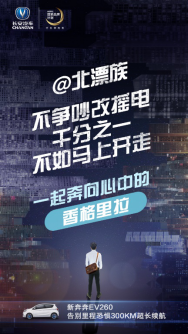 春节之后,北漂的人们又漂回来了,又要过着挤地铁也挤不上、等滴滴也等不到的日子了。当然,对于一小波儿幸运中签者来说,他们又多了一个选择,买!买!买!燃油车摇号难,新能源车同样势头强劲,可以预见在未来的竞争会越来越大。毕竟这种新能源、新体验、新生活、才是时代的新选择。那么现在问题来了,新能源市场乱花渐欲迷人眼,如何买到一辆不后悔的好车呢?!走过路过,这里有辆瞄准占号市场的新奔奔EV260出手不凡,必须关注! 续航大升级 奔奔EV260是在EV180、EV210上的升级之作,虽然三款车型外观相似,但是续航数却不可同日而语。奔奔EV260以综合城市工况251公里,等速(60km/h)300公里以上的超长续航里程,全面提高了驾驶出行的最远距离。加上罕见的多功能方向盘、移动智能互联系统、横跨全球的设计体系,于细节处阐释了什么叫真正的面面俱到。小巧玲珑的新奔奔EV260,就这么成为了都市出行利器,压根不用担心“停车”于途中。 充电加速度 纯电动车最让人担心的莫过于碰上没电了。根据墨菲定律,这种情况很有可能会出现。但是人难免会有粗心的时候,但是新奔奔EV260可以让您把心放回肚子里。充电10分钟,行驶100里,这个神功能简直了!并且充满1次电,还足够“浪”一个星期~当然这一切要归功于与时俱进的先进电池模组,已经历经三代电动车验证,再配上高能量密度的三元材料电芯,既安全又持久,给新生代的消费者吃足了定心丸。 智能安全大提升: 懂车的人都知道,纯电动车与燃油汽车的能量来源差别大的很,显然它的智能、安全就更需要昭然天下!奔奔EV260通过智能控制器对动力系统状态进行实时监控,将一系列潜在隐患统统杜绝,并能够根据车辆状况适时调整动力功能;此外在不幸地发生碰撞事故时,它还可以瞬时切断动力及电力输出,并将残余电压极速降至安全范围,全方位确保整个驾乘过程安全无忧。 认真的讲,新奔奔不仅敢于突破自我,还风风火火闯九州,为本年度长安新能源的发展打响了第一枪;并为长安汽车全新战略“香格里拉计划”做足了底气,为实现2025年停售传统意义的燃油车迈出了关键的一步。有人说,“在一个新的时代来临之际,与其旁观,不如参与其中,而最好的参与方式,就是成为电动车车主。”那么,最幸运的事情就是成为新奔奔EV260的车主。 |