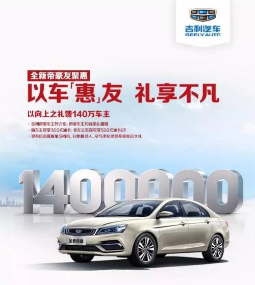 吉利帝豪以可靠品质传承 赢得百万车主认可与信赖 2018年140万车主感恩季 已经盛大开启 即日起至6月30日 老车主介绍亲友购买全新帝豪 即可获赠“最惠客”幸福好礼 什么是“友聚惠”? 吉行天下俱乐部“友聚惠”活动,从2011年开展,每一次活动都在广大车友中引起热烈反响。应广大车友要求,2018年全新帝豪友聚惠活动迎春开启。 什么时候举行? 即日起至6月30日(若名额满4000名,活动时间将提前结束) 谁可以参加? 老车主:吉利帝豪老车主(含帝豪RV、帝豪RS和帝豪两厢) 新车主:全新帝豪 通过什么渠道参加? 1、车主参与活动方式: ●PC端 网址:http://club.geely.com ●手机端 关注吉利吉行天下俱乐部微信公众号 2、全国吉利帝豪授权经销活动操作平台:DMS系统经销商端 怎么参加“友聚惠”? 活动期间凡吉行天下俱乐部认证车主(帝豪老车主),介绍一位车主(新车主)购买全新帝豪车型,并登录活动平台参与完成车主转介绍购车活动的规定流程,则新老车主一并成为吉行天下俱乐部“最惠客”,经吉行天下俱乐部相关工作人员确认后,“最惠客”将获得吉行天下俱乐部提供的专属优惠。帝豪友聚惠“最惠客”只限前4000名,以新车主最终购车时间为限。 参加“友聚惠”,有什么优惠奖励? 1、老车主介绍≤2位新车主 新车主:获得300元油卡1张 老车主:300元油卡*新车主数量 2、老车主介绍3位≤新车主数量<5位 新车主:获得300元油卡1张 老车主:300元油卡*新车主数量+常规免费保养1次 3、老车主介绍≥5位新车主 新车主:获得300元油卡1张 老车主:500元油卡*新车主数量 4、抽奖奖品:单反相机、扫地机器人和空气净化器 新、老车主均有机会获得单反相机1台、扫地机器人1部、空气净化器1台 ?活动福利,什么时候领取? 1、活动结束后15个工作日内,在活动网站公布活动成功参与的车主名单,并在20个工作日发放电子保养券,40个工作日内发放油卡; 2、活动全部结束后的40个工作日内抽取并邮寄单反相机、扫地机器人和空气净化器等奖品。 河北荣神吉利4S店 总店地址:北二环建华大街国际汽车贸易园区西门东行200米 详请咨询:0311-85666990/88881990 24小时救援热线:0311-85662816/85662818 微信公共账号:河北荣神4S店 |