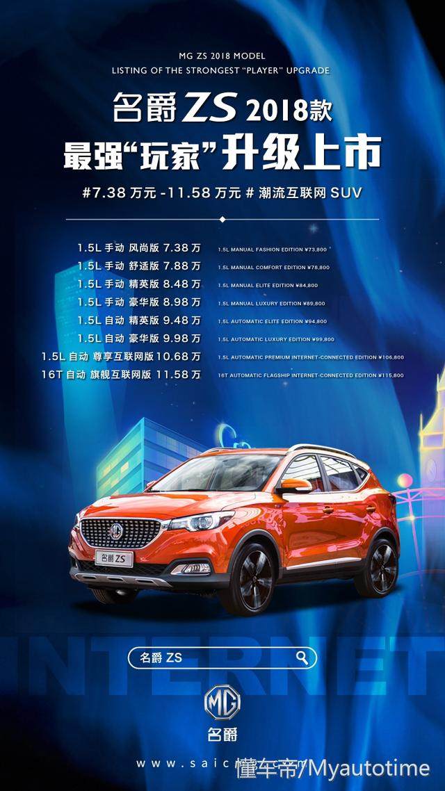 3月7日2018款名爵ZS上市,再启年轻乐趣新章。 8款车型售价: 1.5L 手动 风尚版 7.38万; 1.5L 手动 舒适版 7.88万; 1.5L 手动 精英版 8.48万; 1.5L 手动 豪华版 8.98万; 1.5L 自动 精英版 9.48万; 1.5L 自动 豪华版 9.98万; 1.5L 自动 尊享互联网版 10.68万; 16T 自动 旗舰互联网版 11.58万; 新车在同级范围内唯一配备了LED大灯,质感非凡,新车更将深受消费者喜爱的满天星前格栅、ESP车身电子稳定系统列为标配,并越级搭载主驾6向电动座椅、TPMS直接式胎压监测,高配车型还配备后视镜电动折叠等功能,以7.38万元-11.58万元的心动定价,重新定义年轻人的出行标准。此外,全系车型还推出3年0利率优惠,前2万名购车用户,更可享LED大灯,闪耀再加分。 闪耀质感只为年轻,2018款名爵ZS大手笔配备了远近光一体的LED大灯,以“超强”眼神,让年轻车主直接拥有“灯厂级别”的闪亮体验。 亮度提升3倍的照明效果,不仅闪闪“有面子”,更大幅提升驾乘安全,成为新款名爵ZS以非凡质感收获超高回头率的“爵对利器”。 此前备受消费者喜爱、识别度满分的满天星前格栅,更直接成为全系标配,豪车感、英伦范的正脸让高颜值调性进一步提升。此外,占顶率高达90%的超大全景天窗也得到了延续,为新款名爵ZS质感加分。 豪华配置专属年轻,2018款名爵ZS的越级舒适驾驭与超纲安全,也为天性爱玩的年轻人继续拔高。 全系标配ESP车身电子稳定系统,安全进阶;新增的TPMS直接式胎压监测,随时踏实、安全到位。越级搭载的主驾6向电动座椅、后视镜电动折叠、后排中央头枕等舒适配置,24H实时在线的互联网汽车智能系统的搭载,再加上7.38万元-11.58万元的诚意定价,以及前2万名购车用户可享的LED大灯,让2018款名爵ZS成为年轻人放心开玩的最强伙伴。 与此同时,作为always YOUNG的百年国际品牌,MG名爵的全球步伐同样带着名爵ZS“一起飞”。名爵ZS国内热销,更先后在英国、澳大利亚、泰国、沙特、智利上市,以前所未有的、好玩带感的车主体验,造就全球范围的年轻乐趣。 |