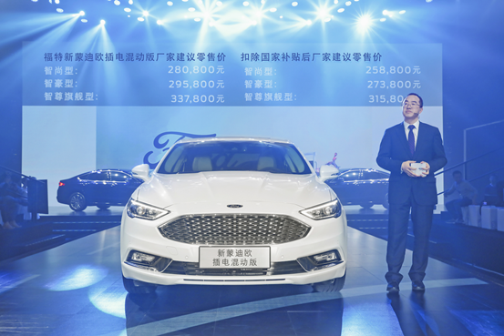 · 福特新蒙迪欧插电混动版正式上市,全系共推出3款车型,供消费者选择。 · 福特新蒙迪欧插电混动版采用福特先进电气化技术,整车百公里综合工况油耗低至2.0升,纯电动续驶里程达52公里,充电时间2.5-5小时。除随车的便携式充电枪,还为消费者免费提供并安装家用充电桩。 · 福特新蒙迪欧插电混动版搭载全新升级的福特派互联,新增无线热点功能,带来更加智能便捷的用车体验。 · 福特新蒙迪欧插电混动版的整车质保周期为3年或10万公里,新能源专用零件质保周期为8年或16万公里。 · 福特新蒙迪欧插电混动版已入选《新能源汽车推广应用推荐车型目录》,2018年消费者购车即可享受国家补贴。 · 福特新蒙迪欧插电混动版售价区间为280,800元至337,800元。 (2018年3月27日,上海)今日,长安福特宣布福特新蒙迪欧插电混动版震撼上市。作为科技网联座驾集大成者,福特新蒙迪欧插电混动版集先进智能科技与电气化技术于一身,为消费者带来更加轻松且充满乐趣的电气化解决方案,进一步满足都市精英人群对于智擎、智行、智联的用车需求。 “随着科技的发展,人们对于智能便捷的生活方式、随时随地的网联体验以及应对资源紧缺和空气污染问题的需求不断增长,消费者亟需更加智能化、互联化、电气化的汽车产品。” 长安福特汽车有限公司市场销售及服务副总裁胡棣锋(Steve Hood)表示:“福特新蒙迪欧插电混动版,正是应消费者需求而来,兼顾最优化的燃油经济性和驾驶乐趣,成为合资品牌中高级车市首款新能源车型。未来,长安福特也将持续推出更多电气化产品,不断满足消费者日益增长的用车需求。” 福特新蒙迪欧插电混动版共推出3款车型,厂商建议零售价为: ![]() 福特新蒙迪欧插电混动版已入选《新能源汽车推广应用推荐车型目录》, 2018年消费者购车即可享受国家补贴。