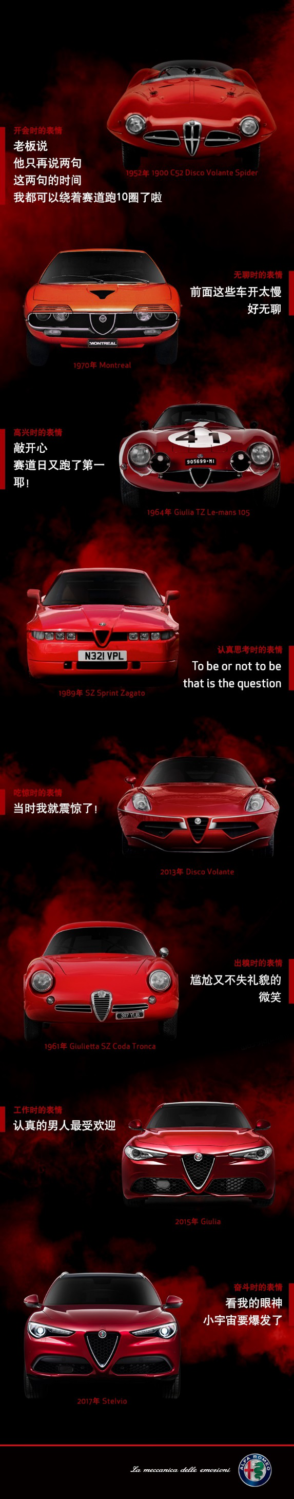 1946年,从战乱中复兴的阿尔法·罗密欧开创了盾形进气格栅的设计。这个独树一帜的的设计使得无需刻意识别,你就能远远地认出——阿尔法·罗密欧。 在意大利四大设计品牌和诸多著名设计师笔下,这个盾形进气格栅和车灯一起组成了各种表情,身为一个Alfisti,这可是一个收集表情包的好机会。 此时此刻的你是哪种表情?你又最爱阿尔法·罗密欧的哪一种表情呢?不妨来留言说说吧! |