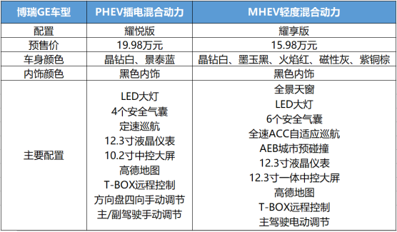 5月15日,备受瞩目的吉利博瑞GE正式开启全国预售。此次共推出两款不同配置的预售车型,其中MHEV耀享版预售价为15.98万元,PHEV耀悦版补贴后预售价为19.98万元。即日起,意向车主可至授权经销商或登陆吉利汽车蓝色商城进行预定,新车将于5月底正式上市。 作为吉利首款科技智混新旗舰车型,博瑞GE率先搭载了由吉利和沃尔沃共同研发的1.5TD+7DCT黄金基础动力,将推出MHEV(轻度混合动力)和PHEV(插电混合混动)两款动力总成的车型,也是目前市场上首个全混动B级车。此次博瑞GE预售推出了多项专享政策,参与预售并成功购车的用户即可畅享5年免费流量和优先提车权;预购PHEV车型的用户还可免费获赠充电桩;此外,5月15日至17日期间参与预定并成功购车的用户,还可获得价值2500元的智能液晶钥匙一把。 本次参与预售的博瑞GE MHEV车型为耀享版,提供了晶钻白、墨玉黑、火焰红、磁性灰与紫铜棕共5种车身颜色,配备了全景天窗、6个安全气囊、LED大灯、12.3寸液晶仪表、12.3寸一体中控大屏、高德地图导航、T-BOX远程控制及主驾驶电动调节等丰富的科技配置。此外,该款车型还配备全速ACC自适应巡航和AEB城市预碰撞,可为用户提供极致舒适的智能出行生活体验。 动力方面,博瑞GE MHEV车型搭载了吉利自主研发的48V轻度混合动力系统,也是国内首款量产的轻混B级车,拥有发动机智能起停、动力辅助、航行模式以及能量回收等功能,综合最大扭矩300N.m,最大功率142KW,百公里加速仅8.9S,综合油耗仅5.8L。值得一提的是,在5月10日刚结束的博瑞GE“一箱油挑战1200公里”京沪极限之旅中,博瑞GE MHEV实测平均百公里油耗更是低至4.3L,动力性、经济性远超同级。 另一款参与预售的车型为博瑞GE PHEV耀悦版,提供晶钻白与景泰蓝两种车身颜色供用户选择,同样配备了LED大灯、4个安全气囊、定速巡航、12.3寸液晶仪表、10.2寸中控大屏、高德地图、T-BOX远程控制等多样化的智能科技配置。 博瑞GE PHEV车型在动力上搭载的是吉利和沃尔沃联合研发的1.5TD+7DCTH插电混合动力系统,百公里加速仅需7.4S,百公里加权油耗更是低至1.6L,堪称目前市场上最节能的混动豪华B级车。其中,纯电续航里程可达60KM,支持3种充电模式,最快仅需1.5小时即可完成充电,同时还可智能设置充电。 作为吉利汽车旗下的首款新能源战略旗舰产品,博瑞GE不仅在造型设计、技术和品质上均代表了当前吉利造车的最高水平,也将成为中国品牌中高级轿车新旗舰,。PHEV耀悦版19.98万和MHEV耀享版15.98万的预售价,无疑让博瑞GE具备了更强的市场竞争力,践行着吉利“不做新能源贵族,让消费者不仅买得起,更要用得起”的承诺,以节能、豪华与科技树立了混动B级车市场的全新标杆。 |