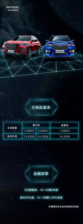 新设计 更时尚 更年轻 全新哈弗H6豪华型/超豪型对外观进行重新设计。蓝标车型换装全新样式进气格栅、雾灯区域装饰,以及排气布局,整体造型更时尚,运动感十足。红标车型雾灯区域换装“C”字形镀铬装饰,产品精致感提升。换装了LED大灯,照明效果更出众,夜间行车安全得到进一步保障。 内饰再优化 舒适性 便利性倍增 新车座椅造型重新设计,更符合人机工程学,提升了乘坐舒适感。增加后排USB接口、PM2.5粉尘过滤、前排座椅加热等功能,车内和行李厢储物空间也进行了优化。 双十佳动力组合 有激擎 更省油 动力系统方面,新车搭载了荣获“十佳发动机”称号的1.5GDIT发动机和获得了“世界十佳变速器”殊荣的7速湿式双离合变速器,并对该动力系统进行软件升级,匹配更平顺,百公里加速仅需9.7s,综合油耗6.8L/100km。 除1.5GDIT动力之外,还推出了2.0GDIT动力,该发动机最大功率为145kW,峰值扭矩为345N·m,让消费者的动力选择进一步丰富。 铠甲安全 出行更放心 全新哈弗H6装备“铠甲安全系统”,车身设计采用独具特色的3DP安全技术,从“乘员、行人、车辆”三个维度,全方位进行防护。2017年,全新哈弗H6公开挑战翻滚测试并完美通过;2018年,全新哈弗H6荣获C-NCAP五星评价。 此次推出的全新哈弗H6豪华型/超豪型在主动安全方面再度升级,新车配备了同级少有的半自动泊车、ACC自适应巡航、360°环视、FCW前碰撞预警和AEB自动刹车等系统,让用车更智能、更安全、更便利。 购买全新哈弗H6豪华型/超豪型还可享受6万元限额贷,18-24期0利息或首付30%起,24-36期6.99%低息的购车政策。 |