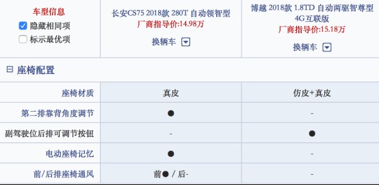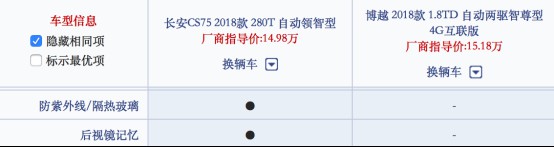 还有就是车内空气净化器已经成了标配,新CS75和博越自然都有配备,不过新CS75的空气净化器多了离子发生器,功能更加强劲了。 当然,如果说博越拥有的副驾驶位后排可调节按钮带来的驾乘感受更加贴心舒适,但相比之下新CS75后视镜记忆、电动座椅记忆、第二排靠背角度调节等功能对于驾乘人员来讲,实用性和舒适性更加直接,小编也就更倾向于选择长安新CS75了。 总结: 都是15万左右的顶配,综合比较,新CS75的改变更加时尚、质感、智能、全面,大尺寸的空间也更符合SUV的定位,也更满足对于动力和舒适度有要求的人,何况在强劲动力保持下,排量、油耗都优胜于博越,在现代讲究节能环保的大环境下,不失为更优越的选择。 |