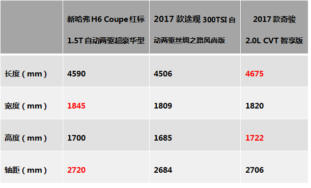 今天我们来一起聊聊三款颇具代表性的王者级SUV 新哈弗H6 Coupe——其所在的H6家族常年稳居中国SUV销量排行榜首位;新途观——合资SUV的销量王者;新奇骏——目前销量最好的日系SUV。 虽说新哈弗H6 Coupe的价格区间在12万元左右,和新途观及新奇骏20万元左右的售价完全是不同的级别,但在产品力上却显得“足智多谋”,针对于三车的详细对比,我们不妨一起去看看。 “有里有面”不怕看 在外观方面,新哈弗H6 Coupe红标版的前脸采用六边形的大嘴进气格栅,搭配造型犀利的大灯,霸气十足。车身侧面采用流行的高腰线设计,搭配19寸轮毂,颇具运动范儿。新途观的外观响应了大众家族一贯的作风——“稳”,进气格栅和大灯贯穿整个前脸,整体是四平八稳的感觉,但略显老气。新奇骏的前脸采用日产家族V-Motion设计,前脸大V字造型搭配宽大的镀铬饰条,进气格栅与两侧大灯相连,整体呈上扬趋势,具有较强视觉冲击力,而车身和尾部则相对更加简洁。当然,一款车的外观审美是个比较主观性的东西,正中下怀就好。此外,值得注意的是新哈弗H6 Coupe的远近光灯都是LED大灯;途观的远近光灯是采用的氙气大灯;而奇骏依然采用的是卤素大灯,这在20万级别的车上让人感觉不够大气。 在内饰方面,新哈弗H6 Coupe采用时下流行的贯穿式设计,内饰以黑色面板和红色真皮包裹为主,并搭配大面积钢琴烤漆面板装饰。中控处的镀铬装饰条提升了内饰的档次感。而新途观的内饰装配工艺还不错,但设计基本可以用过时来形容,甚至没有中控大屏,像是过去的出租车内饰,缺少美感。新奇骏的内饰相对中规中矩,属于简单耐看型。整体来说,新哈弗H6 Coupe的内饰更符合年轻人的需求。 超大空间比一比