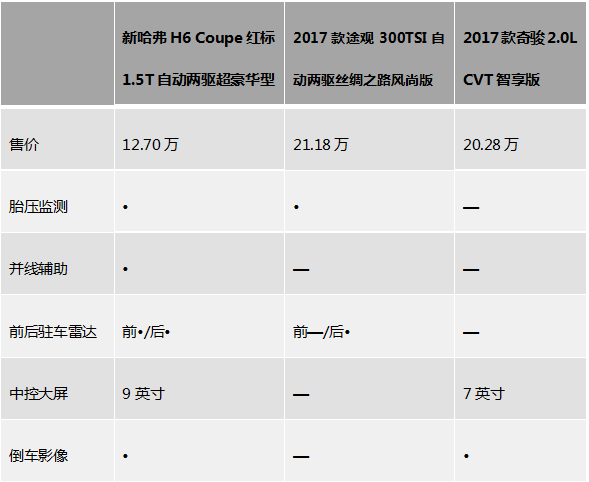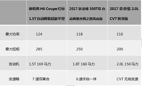 对于喜欢SUV的人群来说,充足的动力可以说是最基本的诉求,不然动力一弱就很容易有小马拉大车的感觉。在动力方面,新哈弗H6 Coupe所搭载的1.5GDIT就是最新的研究成果,其采用了非常先进的CVVL技术,加上缸内直喷、缸盖集成排气歧管等主流技术,最大功率可达124kW,最大扭矩285N·m,完全吊打途观的1.8T发动机和奇骏的2.0L发动机,即便日常出去郊游撒个野也完全没问题。此外,新哈弗H6 Coupe还配备了自主研发的7DCT变速箱,提升了动力输出,还带来很好的燃油经济性。值得一提的是,哈弗的这组发动机和变速箱分别获得“中国心“2017年度十佳发动机及“世界十佳变速器”的殊荣。 越级配置不怕比 从上面的对比数据中我们可以看出,在配置方面,新哈弗H6 Coupe的各项配置堪称越级性的存在。虽然新哈弗H6 Coupe在三者里价格最低,但该有的配置一项不少,有些配置比新途观和新奇骏考虑的更周到。比如安全配置,新哈弗H6 Coupe配有胎压监测、并线辅助、360°环视、驻车雷达等,可以说是相当丰富。在舒适便利配置上,全景天窗、无钥匙进入/启动、8向电动调节座椅、中控大屏等时下主流配置齐全,对比另外两款车型配置,发现他们‘’吝啬‘’不少。在这局的较量中,新哈弗H6 Coupe有着明显优势。 经过3轮较量,相信不用多说,大家都可以看出新哈弗H6 Coupe的实力,出色外观、精致内饰、强劲节油的动力表现以及全面的安全、科技配置都让人印象深刻。作为一款12万元级SUV,新哈弗H6 Coupe在各个方面完全不输20万级的合资车型。如果你想选一款紧凑型SUV的话,不妨考虑下新哈弗H6 Coupe 。 |
