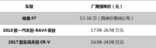 虽然哈弗F7的具体指导价还未公布,但从价格区间上看,哈弗F7的价格区间远低于合资竞品的两款车,如此大的价格差距,究竟它有什么实力和两款合资车型相比呢?我们一探究竟。