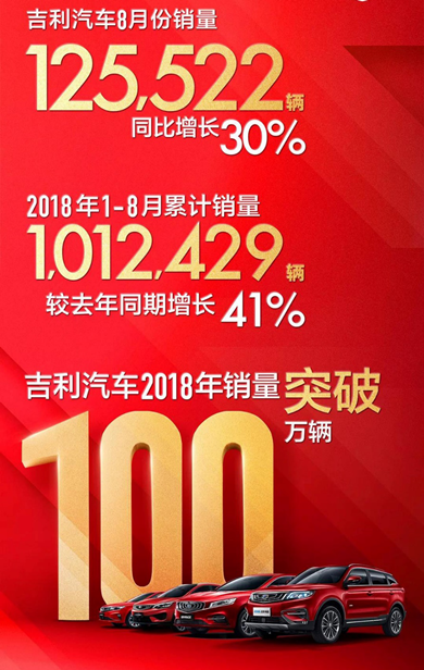 日前,吉利汽车公布2018年8月销量报告,数据显示,吉利汽车8月销量共计125,522辆,同比增长30%。至此,吉利前8月累计销量达到1,012,429辆,较去年同期增长约41%,成为继大众和通用之后,今年第三家销量破百万的车企,并且刷新了中国品牌最快年销破百万的新纪录。如此出彩的销量成绩,主要得益于其完善的产品矩阵以及诸多细分车型的良好表现。