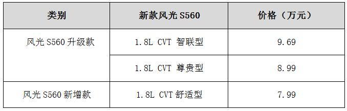 配置方面,新增款车型风光S560 1.8L CVT舒适型搭载了8英寸悬浮式高清显示屏、炫彩液晶仪表、触控式恒温自动空调等一系列配置,不仅让整车操控更加便利,同时提升了整车档次,更具科技感。此外,ESP车身稳定控制系统、倒车影像、定速巡航、上坡辅助等科技配置的搭载,可以让用户尽享科技带来的便捷。升级款车型风光S560 1.8L CVT 智联型和1.8L CVT 尊贵型在拥有新增款车型配置的基础上,更是搭载了全景天窗、真皮方向盘、自动头灯、无钥匙启动系统、无钥匙进入系统等诸多实用配置,大幅提升了用车品质。而胎压监测系统、内置行车记录仪等配置更将充分为行车安全保驾护航。值得一提的是,风光S560 1.8L CVT 智联型还拥有主/副驾驶座电动调节功能,在带来便利的同时有助于驾乘人员精准找到最舒适习惯的坐姿。而360°全景泊车系统、前排侧气囊的搭载,全面提升了行车安全,助力年轻用户实现轻松自驾。