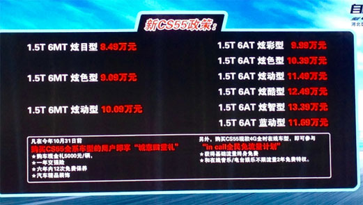10月19日,自由·智在 新长安CS55/CS55蓝动版河北区域试驾暨上市会圆满落幕! 长安新CS55,是长安汽车旗下的一款搭载IACC集成式自适应巡航系统的紧凑型SUV,集炫色、胆色、悦色、劲色于一身,给您智能化驾驶体验、个性化全新选择,舒适惬意超越你的想象。 新CS55售价为:8.49万元-11.69万元,其价格很适合年轻一代人购买,如果走贷款,基本上没有什么压力。 主持人开场 新CS55由长安欧洲设计团队打造,从长安“智色双旋”设计理念出发,以分色悬浮式车顶、炫动红轿跑式喷涂、LED炫酷灯光、X元素座舱设计,呈现出惊艳的生命动感美学。 新CS55源于智色双旋之启迪,长安欧洲设计团队从黑曜石中摄取创作灵感,赋予新CS55源自地壳深处的能量气息,呈现生命美学的张力。新CS55既与CS家族化风格一脉相承,又不拘泥于传统设计理念,以前沿设计雕刻出回归生命本质的美学态度。 新车详解 黑曜石星芒格栅,于内敛中绽放夺目光彩 采用时下流行的高光黑工艺,营造犹如黑曜石般深沉内敛的力量,加之极具视觉冲击力的烫印点阵造型,使得星芒般的光辉绽放其中。无需刻意张扬,但哪怕再黑的夜,也无法掩映其无尽耀眼的光芒。 曜石型面立体车尾,赚足身后惊羡目光 经无数次曲面公式计算而成的曜石型面车尾,尽显宝石般天然质感,与前脸恰当呼应,散发出果敢与张扬;银色护板设计,搭配洒脱的动感镀铬双排气筒,潇洒背影夺慕十足。 360°无死角的绝赞天窗视野,500mm的开口长度,天窗玻璃遮光率高达90%,遮阳帘遮光率97%。遮阳帘及天窗玻璃采取联动设计,雨量感应、语音控制、自动防夹等功能,开合之间安全体验科技魅力。 LED炫酷“灯”场,不落幕的璀璨盛宴 多处LED灯具的高规格配置,营造出自带气场的绚烂,光影交相辉映,时刻震撼视觉感官。 LED 闪酷日行灯: 将位置灯、转向灯、日间行车灯功能合一,采用22颗LED芯片与厚壁聚光注塑新工艺,顷刻点透,耀目流光。每次启动,都会酷炫闪烁,与你心有灵犀,眨眼致意。 LED立体光带尾灯: 由26颗LED芯片所组成的光带,犹如璀璨荧光,通透光芒在夜色下过目难忘。 LED座舱灯光系统: 前顶灯、阅读灯、氛围灯均采用LED灯具,点亮时刻,座舱格调瞬间飙升。 流光紫车身色: 新增流光紫车身色,用更时尚的语言,流动的色彩,独特高贵的姿态,在旅途的风景中,时刻绽放着令人如痴如狂的魅力! 悬浮式液晶屏幕,激活科技探索欲 悬浮式8英寸液晶中控屏搭载全新UI界面设计,按键机械风浓郁,镀铬装饰件炫感十足,流露出极强的科技感;整合in Call智能车载互联系统、倒车影像(部分车型搭载)、全景影像(顶配车型搭载)、卫星导航、ADAS功能开闭等智能科技于一屏中,一触即达。 全新UI界面: 运动、科技、经典三大UI模式,可根据喜好自由切换。炫酷界面带来无与伦比的视觉享受与个性化体验。 全液晶仪表,让你一见倾心 科技十足的全液晶仪表盘,瞬间提升座舱的档次感。不仅为你显示更加丰富实用的信息,更带来赏心悦目的视觉享受,激发你无限澎湃的驾驶欲。 全新时尚Nappa皮纹棕色座舱,犹如肌肤般的舒适触感(部分车型搭载) 新增时尚棕色座舱,采用Nappa皮纹座椅,在柔软度、密实表现度和弹性方面达到惊人的平衡,带来细腻如肌肤般的触感。 【智色·智能驾驶】 新CS55搭载IACC集成式自适应巡航系统、预警辅助制动系统、LDW车道偏离预警等20多项智能驾驶辅助技术,配备新版in Call智能车载互联系统、无钥匙进入系统,随时开启前路美景,用智能捍卫你的驾驭乐趣! 智能驾驶辅助 IACC集成式自适应巡航系统,智能驾乘更进一步(自动挡部分车型搭载) 巡航速度设置范围30-130km/h,工作速度范围0-130km/h。60km/h以下,即使无车道线,也可跟随前方目标车横向移动,实现跟随行驶。拥有单车道智能辅助驾驶、交通拥堵辅助、自动减速过弯等功能,让驾驶更轻松、更安全。 ICA单车道智能辅助驾驶:车道线清晰时,即可智能操控方向盘,使车辆沿着行车道中间行驶,轻松驾驭。 TJA交通拥堵辅助:60km/h以下且无法识别车道线时,可智能操控方向盘,使车辆跟随前车行驶。拥堵道路实现依序排队行驶,从容以对。 自动减速过弯:通过识别前方弯道大小,智能控制过弯车速,出弯后自动加速到驾驶员设定速度行驶,确保安全过弯。 智能限速辅助:智能识别限速标志,驾驶员确认后可自动设定为巡航速度,激情而不逾矩。 场景重构: 通过雷达与摄像头,将车辆距离、车辆类型、道路限速等信息重构,并呈现在仪表盘上,四周车况一览无遗。 语音控制巡航速度:通过语音设定巡航速度,方便、快捷。 ACC全速自适应巡航(自动挡部分车型搭载) 巡航速度设置范围30-150km/h,工作速度范围0-150km/h,可跟随前车停车、起步。通过与博世MPC2Plus摄像头信息融合,50km/h以下可识别有效静止目标并自动减速、停车及跟随目标车起步,在城市工况使用新新CS55的ACC更加从容不迫。 TSR限速标志识别,以多变应前路万变(自动挡部分车型搭载) 搭载最新博世MPC2Plus摄像头,捕捉探测前方限速标志,将识别结果与导航数据结合,通过声音或图像提醒驾驶员遵守交通规则,以人性化科技,最大限度提高行车安全。 FAB自动远光灯控制,用智慧照亮旅程(自动挡部分车型搭载) 黑暗环境下,系统自动开启远光及时提供良好照明;会车、前方有车、环境照明度高,系统自动切换到近光灯。每一项人性化细节,只与欣赏它的人心领神会。 预警辅助制动系