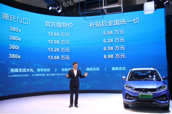 11月16日,合众新能源哪吒汽车携麾下两款新车型“性敢”登陆2018第十六届广州国际汽车展览会。其中,哪吒汽车首款量产车型、备受瞩目与期待的“四好”青年纯电动SUV哪吒N01在本次车展正式上市,四款配置可供选择,从低到高价格分别为:380v,5.98万;380e,6.28万;380i,6.58万;380s,6.98万。同时,将于2019年四季度上市的第二款量产车,哪吒N03也首度亮相惊艳全场。此外,基于对年轻消费市场的洞察,哪吒汽车更是首次对外发布了全新专属创新营销战略—“哪吒汽车云海计划”。 哪吒N01上市 同级高品价比之王 哪吒N01以领先同级的轻松驾控、舒适安全空间、年轻时尚颜值,智能科技体验为用户带来了“好开、好乘、好看、好玩”用车感受,以极具竞争力的价格带来极致越级品质,堪称同级市场中的“高品价比之王”。 为哪吒N01提供动力支持的是为国内外众多高端品牌电动汽车提供高性能电池的宁德时代,得益于自主研发的高效率和高安全等级的BMS系统,其能量回收效率达20%,最高续航可达380公里;快充模式下,哪吒N01可实现30分钟内充至80%,高效解决日常临时补充电量问题,领先同级;哪吒N01最大扭矩为175牛·米,0-50km/h加速小于等于4.9秒,实现了堪称同级优秀的驾控性能。哪吒N01的长宽高尺寸分别为3872×1648×1611mm(加行李架),轴距为2370mm,同级中尺寸极具竞争力,279L的后备箱储物空间,足以在城市游走时无视“重负”轻松出行;皮质座椅采用凹陷运动式设计,更强的包裹性让驾乘人员可以完全“融入”其中,大大加强在驾驶中的横向支撑,减缓驾驶疲劳,带来更舒适的驾乘体验。而HSL安全车身设计理念,58%高强度钢的应用,5C+3H闭环结构,铝合金及复合材料的大量使用,使整车安全可靠耐久得到充分验证。 明明可以靠实力,偏偏在“颜值”上也毫不逊色,哪吒N01前脸造型采用上小下大的分割比例,高度集成式前大灯绝对是闪耀自我的标配,展翼式个性前格栅采用时下流行的钢琴烤漆面板,前脸设计醒目的镀铬亮条,增添车辆时尚气息,灵动热情,释放年轻力。 而内在汇聚的智能科技更是让人乐享智能互联的高效便捷,全系标配无钥匙进入+一键启动,10.1寸智能触控屏,自动空调,蓝牙音乐等功能,并具备手机蓝牙APP开锁功能,无需钥匙在手,便可以轻轻松松一键搞定,即开即走。依托“H-cloud云服务平台”,哪吒N01实现车辆与用户“数字终端”及“数字生活”的无缝衔接,全面覆盖驾乘者出行生活每一处场景,满足年轻消费者对更智慧、更个性、更前沿的消费追求。 哪吒N03首秀 2019年四季度量产上市 基于概念车Eureka 01打造的第二款量产车哪吒N03也在本次车展耀世首秀。产品定位“精品智能纯电动跨界SUV”,目标用户瞄准追求品质乐趣生活的年轻人群——注重科技体验的都市小康、都市新移民、乐趣时尚族人群,未来将于2019年四季度量产上市。 哪吒N03首次采取用户场景需求驱动与正向平台模块化整合的设计理念,即逆向思维推导用户未来用车场景,将前瞻性的产品功能搭载到全新模块化开发的产品上,使得产品的功能装备及设计感官品质远超越当今时代产品。其核心理念涵盖智能座舱、智能驾驶、极致性能、越级体验四个维度。以及CNCAP五星安全车身结构。 在智能座舱的内饰上采用了25寸悬浮贯穿一体式显示大屏,CONSOLE前部配备8寸多功能触摸屏,车内A柱上首次应用“透明A柱”,仪表台上部装备具有主动交互功能的“小You”智能机器人,整体内饰设计理念实现了尊享感与人机工程操控的完美结合,使得车内未来感更加浓厚。 哪吒N03将搭载L2.5级智能驾驶系统,涵盖APA一键式全自动泊车、TJA交通拥堵辅助、AEB紧急制动、ACC全车速自适应巡航等20余项全球领先的自动驾驶系统,同时还配备了18个传感器雷达,解放驾驶者双手双脚,让驾驶更自在,更安全。 性能设计上,续航里程达400-500公里,百公里加速仅4.9s,最大功率200-250Kw,最大扭矩525-615N ?m,电池能量密度达到了160-180wh/kg,并采用了合众新能源自主研发的H-EPT电控系统,可实现HSafe 4D一体化安全防护和NEDC >90%的驱动系统效率,做到极致性能与高效动力的完美平衡。 哪吒N03长宽高为4200*1800*1550mm,2700mm的轴距提供了越级的舒适空间体验 ,车辆外部搭载了感应式全LED前大灯、贯穿式全LED尾灯、感应式电动尾门、超大全景天窗,车内还搭载生物遗留探测系统、DIY个性化装饰、智能交互多色氛围灯、智能车载终端、手机无线充电等越级功能,给予用户超值体验享受。 凝聚了哪吒汽车对下一代智能移动终端的倾力诠释,哪吒N03完美地沿袭表达了“自·信·在”设计哲学。其整体比例坚定而极富冲击力,侧面强调大轴距与“四轮四角”设计理念的融合,用急剧收缩的前后悬衬托出大轴距、大空间的比例优势;侧面线条则较顿挫有力、转折蓄势,含蓄表达出强大的力量和动势。车头和车尾以横向开放线条为主题,将前后大灯的科技感和整车的年轻个性融合在一起。而整体外观,则使用了大块面的强硬元素和鲜明的色彩对比,进一步强调不容置疑的个性气质。 “哪吒汽车云海计划” 随着新能源汽车市场份额的迅速增长,企业在不断推出新品的同时,也在积极探究如何拓宽用户触点,让渠道充分下沉,使用户能够更为便捷高效的体验汽车出行消费。在传统的营销模式中,4S店往往因为单一的销售体系和重资产模式,很难大规模渠道下沉,这使得用户无论是试驾还是维修,都会面