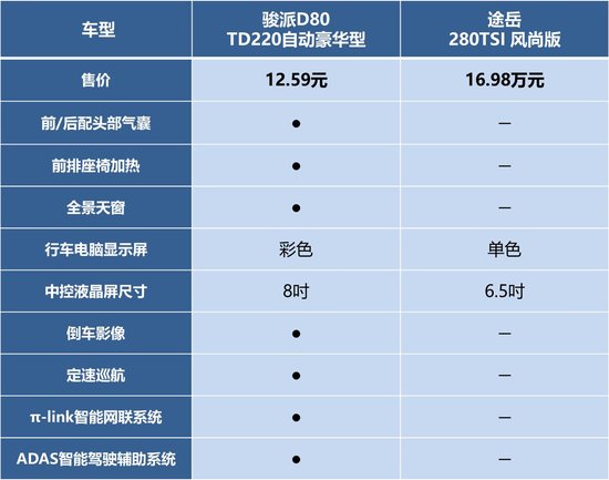如今的SUV市场正迎来多重变化:自主品牌不断向上冲击市场,合资品牌也开始向下挤压,希望分得一杯羹。对于新上市的天津一汽骏派D80来说,除了自主竞品外,还有途岳等合资竞争者。面对夹击,骏派D80的竞争力如何?我们不妨拿“骏派D80 TD220自动豪华型”与“途岳280TSI 风尚版”做个对比。 颜值与设计的比拼 首先我们来聊聊造型。产品外观虽是“仁者见仁,智者见智”,但对于汽车,多数人都会以主流眼光去审视。放眼A级SUV车型,笔者认为时尚、大方且有精致感的车型更受大家认可。 骏派D80的外观偏年轻时尚,前脸冲击性很强,进气格栅配以3D熏黑保险杠显得很精致,“光影雕塑设计”风格营造出强烈的运动感,尾部贯穿式尾灯、双边两出的排气设计也很吸睛。 而途岳采用了家族设计语言,正方形大灯、粗壮的镀铬前格栅、线条与棱角的勾勒,让它的造型很硬派。 空间尺寸的对比 从驾乘空间来看,两款SUV均采用5座布局。笔者从实际尺寸数据来比较一下两者的空间表现。 通过对比尺寸参数可以发现,途岳除了高度比骏派D80多了6mm外,其他数据都是骏派D80有明显优势,这也赋予了骏派D80更优秀的空间表现。另外,“骏派D80 TD220自动豪华型”拥有“四向防夹”全景天窗,使用舒适安全,这是“途岳280TSI 风尚版”所不具备的。 总体来说,骏派D80整体尺寸比途岳大,空间表现出色,途岳虽说车身尺寸不占优,但空间表现尚可,后备厢空间比骏派D80大一些。 动力够用就好 动力配置上,“途岳280TSI 风尚版”采用“EA211 1.4T+7速双离合变速箱”的动力组合,虽有可圈可点之处,但考虑到其售价要16.98万,相比“骏派D80 TD220自动豪华型”显得性价比不足。 骏派D80全系搭载一台TD220涡轮增压加缸内直喷发动机,得益于“十大创新技术”,该发动机在最大程度发挥燃油效率的同时,还为整车赋予了不错的动力表现。另外,其拥有不错的节油性能,百公里油耗最低可达6.1L。这也让它荣获了“中国心”2018年度十佳发动机称号。 总体看来,两车的动力表现差距不大,但骏派D80的性价比更高。 科技配置:骏派D80更高一筹 在消费者重视的科技配置方面,两车表现如何呢? 骏派D80没有让大家失望,拥有众多安全科技配置。全系标配ESP电子稳定控制系统、TCS电子牵引力控制系统、EPB电子手刹+AUTO HOLD自动驻车。“骏派D80 TD220自动豪华型” 还搭载了各类人性化配置,包括7吋液晶仪表盘、前排座椅带加热、定速巡航系统、π-link智能网联系统以及ADAS智能驾驶辅助系统。 其中,π-link智能网联系统可实现车辆远程控制、车内语音操控、车辆安全诊断等操作;ADAS智能驾驶辅助系统集合了车道偏离监测、前方碰撞预警、智能远近光切换、智能限速提醒、驾驶员疲劳驾驶检测等五项功能,有效保证车辆行驶安全。 骏派D80内饰 骏派D80全景天窗 综合来看,“骏派D80 TD220自动豪华型”在配置上更加丰富,并融入了很多科技元素,而这些都是“途岳280TSI 风尚版”所没有的。 可以看出,骏派D80在空间、配置等硬性指标上占优,但途岳背后的大众品牌认知度也不可忽视。综合来说,两车的实力都很强。笔者认为,如果你在乎品牌可以选择途岳;如果你不喜欢随波逐流,对汽车的综合性能十分看重,骏派D80一定会是不错的选择。 |