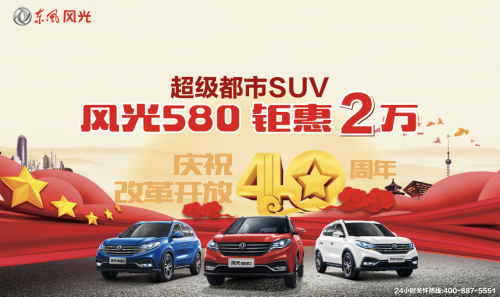 今年正值改革开放40周年,40多年来中国汽车产业同样是改革开放的亲历者、见证者和受益者。年轻向上的中国汽车品牌——东风风光沐浴在改革开放春风里,更是不断成长,快速发展,旗下首款SUV车型风光580在上市至今销量即将突破40万辆。践行“一切为了用户,超级奋斗,拥抱改变,诚信可靠,价值共享”的核心价值观,东风风光于改革开放40周年的年末购车季感恩回馈社会,优惠让利用户,特推出黄金购车季的重磅官方钜惠活动,用户即日起入手风光580,优惠额度最高可达2万元,助力用户年底轻松购车。此次活动高达2万元的让利幅度,将全系的竞争力再次推高到一个新的层级,着实令市场和用户为之震撼,对于有意向购车的用户现在无疑是入手的最佳时机,具体可详细咨询当地4S店。