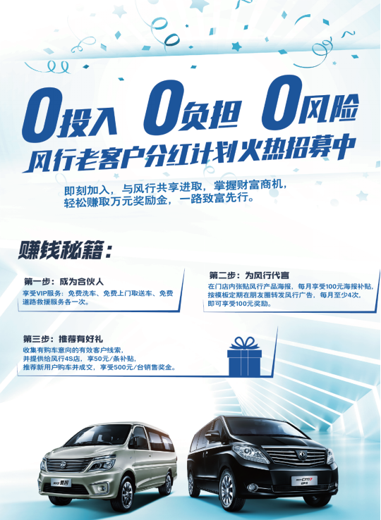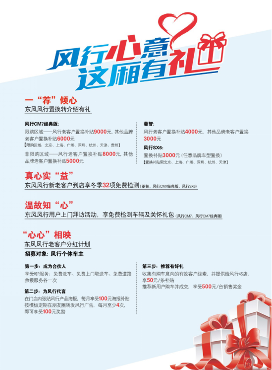 买车,不是靠一瞬间的冲动,而是凭全方位的考量;拥有一辆车,需要的不仅仅是一时的满足,更应该看重的是后续的服务和保障。把客户当成老朋友,给到始终如一的陪伴和关怀,东风风行一直在身体力行。在2019新年来临之际,“风行心意,这厢有礼”系列活动陆续展开,风行致力于提升用户的归属感和满意度,力求给到“老朋友”们最放心的保障和最实在回馈。 风行向来注重产品力以及优惠政策,有质量又有感情的风行心意,正吸引众多车主抱着高昂的兴致参与到这次系列活动之中。感恩回馈正当时,这次的活动主要通过以下四个环节展开。 一“荐”倾心 老客户们收到来自风行的邀约,参与到“东风风行置换和转介绍有礼”活动。购买全能商务车菱智,享8180元购车礼包或最高4000元现金优惠,置换享最高4000元补贴。推荐朋友到店看车可获50元购物卡,若推荐购买成功,还可获500元油卡。不管是想换车,还是想买车,来风行一“荐”倾心,总有一款最适合你的优惠政策等着你,快带上你的朋友来店看车吧。 真心实“益” 正值寒冬,风行暖心推出“冬季免费车辆检修服务”,通过对底盘系统、车身系统和电瓶等多方面全方位的检测,为客户提供最专业的车辆检修,多一份安心和保障。当然,在爱车检修期间,等待你的还有“新车试驾体验”活动,你可以通过试驾风行全新中高端商务车,感受风行的质感升级技术突破,更有好礼相送,10斤装的品牌大米及一桶5L装品牌食用油,真心实“益”温暖你的生活。 温故知“心” 风行对CM7开展上门关怀活动,为客户提供免费检测车辆服务,介绍车辆养护知识,解决客户车辆问题,并赠予精致的礼品。对于客户的支持与肯定,风行一直心怀感恩;风行的诚意和关怀,也让客户更加放心和信赖。在一次上门拜访期间,一位车主讲述了他与风行的羁绊,风行陪伴着他走过了一条或有趣、或温暖、或坎坷的路,风行在老客户的眼中,已经不仅仅是一辆车而已,更是自己情感的寄托。 “心心”相应 风行诚意开展“老客户分红计划”,老客户可以与试点4S店签订协议,成为风行合伙人,随即开通风行VIP服务,可享受维修保养免费上门取送车、免费道路救援,以及五次免费洗车。当然,作为合伙人,职责就是为风行做宣传,有门店的合伙人在门店内张贴风行产品海报,或每月转发产品宣传至朋友圈4次以上,每月给予100元补贴;收集有购车意向的客户线索,并将销售线索提供给试点4S店,对有效线索给予50元/条补贴;若合伙人推荐成交,每台车给予500元奖励。0投入,0负担,0风险,轻松月入过万,风行老客户分红计划正在火热招募中。 “这是一种宾至如归的感觉,选择风行就像是结交了一位知心的老友,总能给到我惊喜和温暖的感觉。”,一位车主如是说。确实,“陪伴”一直是风行向客户承诺的信条。本次活动,风行菱智最大的愿景就是可以给到客户们强烈的归属感, 让他们在拥有全面优质的售后服务的同时,还可以体验到风行制造的小惊喜、享受到实打实的回馈和收益。 东风风行菱智的客户已经超过70万,秉承着以客户利益为出发点的理念体系,菱智的售后服务愈加周到,推出5年或10万公里超长质保政策,给到消费者最实在的保障。街头巷尾总会有菱智的身影,实打实的销量印证了风行品牌优质的驾乘体验,以及风行企业文化中所蕴含的真诚和用心。 寒冬岁末,新年将至,本次“风行心意,这厢有礼”系列保客活动仍在继续,风行和它的“老朋友”们拥有着彼此信赖的羁绊,感情仍在持续升温,这个充满爱的大家庭期待你的加入! |
