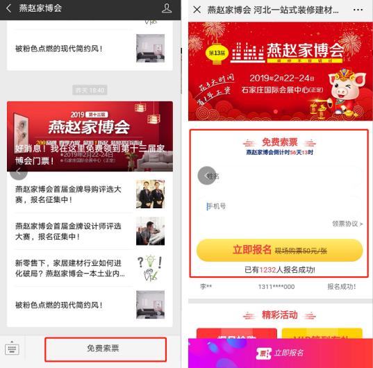 2019第十三届燕赵家博会将于2月22日-24日在石家庄国际会展中心(正定)隆重举办!免费索票通道正式开启啦!!抓紧看过来吧!索票时间一直到展会开始前一天都是可以来免费索票的哦!如果还没有关注我们官方微信平台的小伙伴,抓紧时间前来关注、报名吧!免费的机会,谁愿意错过?~那么怎样免费取得此次燕赵家博会的门票呢?今天小编就来科普一下啦,超级简单!Now,索票流程↓↓↓ 即日起,免费索票开始啦!!索票流程↓↓↓ 索票方式: 1、微信索票 关注“燕赵家博会”微信公众号(微信号:yanzhaojiabohui),进入公众号后点击下方“免费索票”进入报名页面,填写姓名+手机号后,点击立即报名即为报名成功; 2、电话索票 您可以拨打电话【85365659/85365673】进行报名哦,接通电话后,您只需要报上您的姓名+电话即可,我们都会进行登记~ 特别提示: (1)家博会门票分为普通门票和VIP门票(20元现场可退),普通门票仅限用于进场;VIP门票可获赠家博会会刊,得万元装修基金,还可享vip专属签到礼、免费餐饮服务。 (2)通过以上两种方式索票的小伙伴,您成功提交报名信息后,家博会客服人员将与您联系,普通门票会将电子门票以短信形式发送到您的手机上;升级为VIP门票的业主,除了发送vip电子门票,还将邮寄VIP纸质门票、会刊等资料。 (3)没有免费索票的小伙伴,那么您只能在现场花钱买票入场了,单张票价50元! 其他问题: 一张票全家3-6人可以用吗? 可以用的,这样做是为了让小伙伴们可以带家人一起来观展,方便在购物选择的同时家人可以提供一些意见和建议,您也可以带您的朋友,闺蜜前来观展。和家人、朋友其乐融融选购家居装修物件,多好啊! 需要装修新房、购买家具的小伙伴们,赶紧免费索票吧?第十三届燕赵家博会与您相约!2019年2月22日-24日,我们不见不散! 2019第十三届燕赵家博会 展会时间:2019年2月22日-24日 展会地点:石家庄国际会展中心(正定) 咨询热线:0311-85365659 官方微信:燕赵家博会(yanzhaojiabohui) 官方微博:@河北燕赵家博会 免费索票:www.yanzhaojiabo.com |
