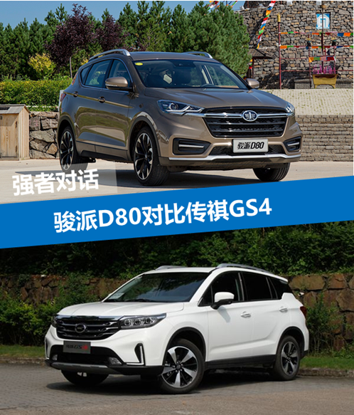 对消费者来说,10万多预算选一台SUV是个头疼的问题,因为这个区间内车型很多,且实力都不错,其中,骏派D80的出现不仅让人眼前一亮,安全智能化配置也是一大亮点。碰巧在自主品牌阵营里,传祺GS4也是一个热门选手,其售价与骏派D80也高度重合。那么问题来了,这两款车实力如何?我们本次选取“骏派D80 TD220自动豪华型”和“传祺235T 自动两驱至尊版”进行对比。