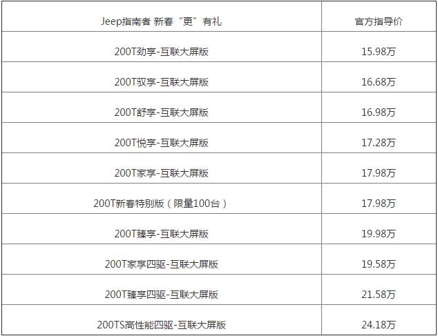 大气之上更炫:限量100台双拼车身新春特别版,赚足回头率,体面感十足 · 安心与品质之上更大更酷:入门即升级标配同级更大7英寸屏,家享及以上版本搭载8.4英寸大屏,全系升级标配CarPlay &CarLife,增配不加价 · 感恩近*15万车主信赖,1月31日前购Jeep指南者至高可享“36期0利率”金融政策 Jeep指南者 新春特别版 在全球知名SUV品牌的魅力支持下,Jeep指南者自上市以来,迄今已收获近15万新中产家庭的信赖。为继续回馈消费者厚爱,Jeep指南者首次推出限量双拼车身新春特别版,入门车型即升级标配同级更大7英寸大屏,家享及以上版本搭载8.4英寸大屏,全系升级标配CarPlay &CarLife,增配不加价,奏响开春最强音。 · 大气之上更炫:限量100台,同级罕见双拼车身新春特别版,赚足回头率,体面感十足 在春节期间开车上街,车流往来不是套娃车就是相对无趣的买菜车,什么回头率?不存在的! 但Jeep指南者却能在此时此刻赚足满满的回头率,在走亲访友时面子感十足。 Jeep指南者具有紧凑级SUV里极强的辨识度和现代感,七孔盾式格栅等家族专业基因的传承、一体式镀铬饰条贯穿侧窗与车尾形成同级独特的细节设计,而就在这样大气的外观设计语言之上,更炫的限量双拼车身车型正式来临:全新的黑色车顶与原有的全景天窗和硬朗腰线完美融合,双拼车身带来更强的视觉冲击感,在动感的设计语言中又不失沉稳的气质,这样同级车型中罕见的双拼车身,注定要成为这个新春里无比吸引眼球的街头炫色,满足都市中产家庭对于在选择家用车时,除了外观要好看满足视觉动物的执念之外,还要出门在外体面有格调的挑剔需求。 安心与品质之上更大更酷:入门即升级标配同级更大7英寸屏,家享及以上版本搭载8.4英寸大屏,全系升级标配CarPlay & CarLife,增配不加价 新春开着车带着一家子欢欢喜喜地去拜年,最重要的自然是车里老小的安全安心。Jeep指南者以Jeep 4x4 SUV智能科技体系打造,在“动力 四驱 安全” 三方面的硬件实力自然不用多说,以70项主被动科技+64%高强度车身打造“中美欧澳”四重安全评级认证大满贯,悉心周全地保障驾乘者享受每一段旅程;而驰骋江湖的Active Drive智能四驱系统,能在4x4=17种日常城市驾驶情形下的安心守护,更有1.4T+9AT黄金动力总成,在拥有澎湃动力的同时还兼顾燃油经济性。在工艺方面采取世界级WCM制造标准打造,让其品质感也得到了更佳的保障。 在这样的保障之下,Jeep指南者还有了更大更酷的互联科技加持—— 更大:入门即升级标配同级别更大尺寸的7英寸屏,家享版及家享以上版本的车型则搭载8.4英寸大屏,内饰整体设计彰显大气,又富有满满的科技感; 更酷:全系升级标配CarPlay &CarLife手机互联系统,完美解决“二屏合一”难题,不管家人是苹果手机还是安卓系统手机统统都能无缝衔接,车在路上,但数据生活同样一路相随。 今天,Jeep指南者将继续满足消费者们的挑剔需求,给出这个季节的“暖冬好礼”—— 1月31日之前购买指南者,至高可享“36期0利率”金融政策,而全国仅限100台新春特别版也即刻限时开卖。同时,扫码登陆天猫商城Jeep汽车官方店,便可参与10元抢购“新春特别版”活动!拥有品质与安心双重实力的Jeep指南者,内外兼修带来十足诚意的暖冬好礼,将全方位满足颜控、内饰控、技术控们的挑剔需求。 |