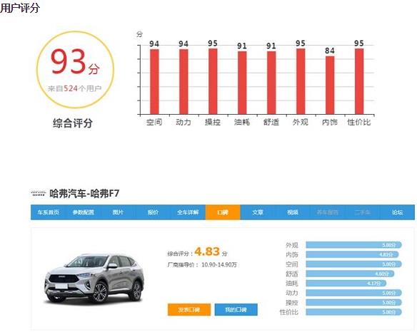 今天小编要解析的车型是去年底刚上市的哈弗F7,它是一款紧凑型SUV,所属厂商为长城汽车。哈弗F7官方指导价10.9万元-14.9万元,有丰富的配置供消费者选择。哈弗F7上市当月,只用三周时间,就交出了6067辆的销量成绩,12月销量更是破万,达到11042台,爆款SUV已然成势。今年,哈弗全球销量跨入500万辆大关,成为中国首个进入500万俱乐部的专业SUV品牌。哈弗F7作为一款全球车,销量的向好,势必助力哈弗的全球化之梦进阶。哈弗F7在消费者中的口碑如何呢?现在我们就来一起看下。 根据网友口碑数据报告:哈弗F7 1月综合口碑评分为93分,在同级别车中表现出色。车主主要对哈弗F7的外观,空间方面比较满意,在动力及操控方面也比较满意。下面我们就来看看各项具体口碑评分与评价。 智能互联系统: 汽车之家 起琼hja: 评论车型:哈弗F7 2019款 2.0T 四驱i悦 我喜欢它的智能互联系统,2000万+QQ在线音乐,长时间开车,一路上不无聊。哈弗F7还能自定义语音唤醒词,比如小芳,小红什么的,旅途中能当一个聊天的对象!是不是很棒! 易车 uuyy: 评论车型:哈弗F7 2019款 1.5T 两驱i潮 “我冷了”空调加温,“我想透透气”天窗开启,“我饿了”推荐附近餐厅并导航,这要归功于哈弗F7强大的超级语境识别能力,语音识别率高达97%,开车和女朋友出去约会别提多方便了。 潮流外观: 汽车之家 巫山云雨: 评论车型:哈弗F7 2019款 2.0T 四驱i悦 外观是我最满意的地方,作为一个颜控选手,对于车的第一要求就是颜值一定要高。跟老一辈不同,我们年轻人消费,主要是感性消费区为主。哈弗F7的外观设计很动感,尤其是大嘴式的前中网,配合LED大灯和日间行车灯,显得霸气十足。刚提车回去的时候,开在路上很受关注。侧面流线型的设计也很不错,十分动感,符合年轻的定位。 易车 两千万的光棍: 评论车型:哈弗F7 2019款 1.5T 两驱i潮 哈弗F7的外观设计个人认为是这个价位里最好看的。1、前中网的凹凸感很强,给人一种霸气的感觉。2、LED大灯和日间行车灯很好看,科技感很强。3、车身侧面流线型设计的很好,明明定位是SUV,却有一种轿跑的感觉,很有运动感。 可靠操控: 爱卡 挥鹏长翅: 评论车型:哈弗F7 2019款 1.5T 两驱i潮 车子的操控很好,就比如多功能方向盘,开车途中有电话或者是调节音量直接就可以在方向盘上操控,双手不需要离开方向盘。而且还可以启用语音控制,很方便。油门刹车控制起来也很灵活!控制杆手感也非常好,超级喜欢。 易车 Dijaijw: 评论车型:哈弗F7 2019款 2.0T 四驱i悦 方向盘调校还行,方向盘不沉,很有层次感,平底运动型方向盘看起来很不错,悬架做的也不错,转弯的时候支持感很好,四驱给人的感觉就是很安全,走一些破路、土路的时候,颠簸感不是很大,悬架调校的也不错,底盘舒适感也还行。不过过减速带顿挫感还是有的,这个价位性价比已经很高了。 高效动力: 新浪汽车 史地分柱: 评论车型:哈弗F7 2019款 1.5T 两驱i秀 动力棒棒的,涡轮介入的很合适,标准模式在城里开基本没问题,高速必须经济模式,开启ACC自适应巡航很省油,激情一点的话就是运动模式,动力输出相当给力。 搜狐汽车 metalstr: 评论车型:哈弗F7 2019款 2.0T 四驱i悦 2.0GDIT四驱,动力自然十分充沛,平时城市道路情况下,标准模式就够了,想省油的话,就开经济模式,这两个模式区别不是特别大。想体验一下极限的话,可以切换成运动模式,油门踏板的灵敏度顿时增加不少,轻踩油门发动机的响应就很迅速,基本踩到一半的时候,转速就已经飙到4000多了,推背感十足,发动机的轰鸣声音也十分好听,几次等红绿灯的时候,体验过运动模式,瞬间秒掉其他车。 经济油耗: 搜狐汽车 metalstr: 评论车型:哈弗F7 2019款 2.0T 四驱i悦 ,之前看哈弗F7智能节油赛百公里油耗低至6.03L, 可能因为我是老司机的缘故,油耗表现在7个左右,作为一台2.0GDIT的四驱SUV,这个油耗我很满意。 爱卡汽车 abt9s6w4d: 评论车型:哈弗F7 2019款 1.5T 两驱i潮 目前行驶380公里,油耗表现不错。高速80公里/小时,油耗到6.7~6.8L。城市路段表现:全城市路段,最近跑了100公里左右,油耗8.7-9.1,相当满意。对于一款接近于中型SUV的车型来说,哈弗F7这么大的个头,能有这样的油耗表现我非常满意了。 舒适空间: 汽车之家 伊iwhj: 评论车型:哈弗F7 2019款 1.5T 两驱i酷 哈弗F7的舒适性很好,座椅号称是包裹性座椅,确实坐上感觉包裹感很好,座椅皮质摸起来手感不错,中间扶手箱设计合理,开车开久了胳膊放在上面长短途适中。后排中间没有凸起,对后排来说是非常舒服的一件事。四个窗户都是一键升降,后排用起来很方便。总体来说,哈弗F7的舒适性算是这个价位的SUV里很不错的。 网易汽车 天空之蓝: 评论车型:哈弗F7 2019款 1.5T 两驱i潮 哈弗F7的空间不错,我178的身高,坐进去之后,一点也不感觉拥挤,头部空间很高,不感觉压抑。副驾驶坐起来也很舒服。后排空间挺大,坐后面可以跷二郎腿了都,而且中间没有大鼓包,对于中间的人来说很友好。试过满载5个成人,毫无压力,还有很多空隙,我感觉后排坐4个成人都没问题。后备箱中规中矩,不过装过小孩的手推车没问题。 豪华内饰: 汽车之家 由由032:评论车型:哈弗F7 2019款 1.5T 两驱i酷 内饰真的是我最满意的地方,中控台宽厚,座椅皮质上乘,所有皮质用料以及走线都非常用心和精准,坐过我车的人都觉得内饰是最能体现品质的,而且还有一个我相当喜欢的鸡腿档,设计感满满。 爱卡