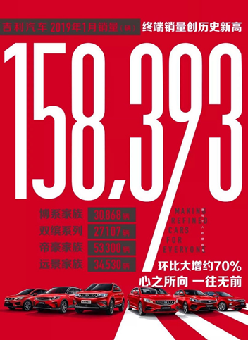 近日,吉利汽车官方公布了2019年1月销售数据:1月销量158,393辆,同比增长2.1%,环比增长超过70%,迎来2019年市场的开门红。这一销量数据不仅刷新了吉利汽车单月销量历史新纪录,也创下终端销量历史新高。