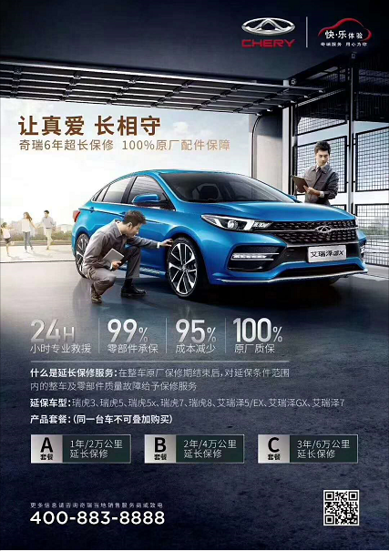爱车在使用过程中,很难避免会遇到问题,若是在保修期内那大可不必担心,很多费用都无需自己承担;如果出了质保期,车子没有出现任何故障,那也没有太大问题;最怕的就是,没了质保爱车却出了大问题,那可能上万的维修费都要自己承担,真是压力山大! 别担心,因为奇瑞汽车准备了超值延保套餐,为各位车友排忧解难,奇瑞6年超长保修,100%原厂配件保障,让你安心行车,悦享无忧驾乘。 四重优势,安享驾乘无忧 延保,是整车原厂保修期结束后,有偿提供的延长保修服务。奇瑞汽车延保服务,从用户角度出发,四重优势全方位保障车主权益。 24小时专业救援 延保期内,奇瑞车主可享受24小时专业救援服务。无论你在何时何地,只要拨打400电话,就会在第一时间得到奇瑞的专业救援,有便捷服务保驾护航,纵享驰骋乐趣。 100%常用件承保 购买延保服务后,爱车100%常用件都在承保范围内,超值服务更省心;而且延保期内如发生故障,可在全国任意一家奇瑞授权经销商处享受延保服务。 95%成本减少 当车子发生了延保期范围内的故障时,汽车服务商将承担所发生的维修费用,包括人工费、配件费和原厂道路救援的费用等,能够为车主节省大量用车成本。 100%原厂质保 延保服务期内,爱车可享受来自原厂的保修服务,100%原厂配件,品质可靠车主更放心。 三大套餐,乐享超值优惠 奇瑞汽车延保服务共设置了三种套餐,每种套餐针对不同车型单价不同,多种选择任你挑,价格优惠更超值。 让真爱长相守,小投入大保障。现在购买奇瑞延保服务,就能为爱车多增加一份保障,也让你的行车路途更加安全,让你可以纵情享受驰骋快感和驾驶乐趣,放心上路,安心前行。 |