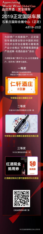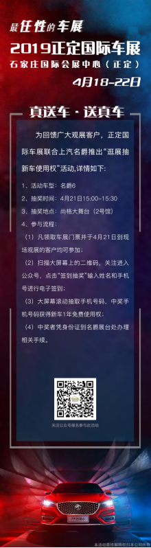 展会名称:2019正定国际汽车展览会暨新能源·智能汽车展|房车露营展 展会时间:4月18-22日 展会地点:石家庄国际会展中心(正定) 2019正定国际汽车展览会暨新能源·智能汽车展|房车露营展(简称:正定国际车展)启用石家庄国际会展中心1、2、3、8四个室内展馆及室外广场,吸引了超豪华、豪华、进口、合资及自主70余个汽车品牌参展,近千余款热门车型,作为华北第一大展各大汽车厂商纷纷拿出购车最高优惠政策,车展组委会更是联合厂家、区域、经销商三方推出“特价车专区活动”。2019正定国际车展将为广大市民呈现一场集“科技、时尚、钜惠”于一体的汽车文化盛宴! 2019正定国际车展开幕在即,各大厂商纷纷参展,各大活动重磅加持。现有车展最全观展攻略,祝您观展无忧,好吃、好看、好玩、优惠+活动,教你玩转车展现场! 【观展时间】 2019年4月18日-21日 9:00—17:30 2019年4月22日 9:00—14:00 【门票获取】 购票时间:4月18日-4月22日 微信购电子票:25元/张 (通过扫描车展现场二维码参与线上购票) 现场购纸质票:30元/张 (车展现场官方指定售票中心) 【票证查询】 1、请前往官方指定渠道购买车展门票,所有电子票和电子证若不慎删除短信信息,均可通过官方微信“正定国际车展”菜单【我的票证】进行查询。 2、由于现场人流量大,易造成网络拥堵,建议观众提前打开电子票/证二维码,长按页面或截图保存为图片,便于快速扫码入场。 【参展品牌】 劳斯莱斯、宾利、保时捷、玛莎拉蒂、奔驰、宝马、奥迪、林肯、捷豹、路虎、红旗、上汽大众、东风日产、东风悦达起亚、广汽本田、一汽丰田、一汽大众、长安马自达、北京现代、别克、雪佛兰、广汽三菱、江铃福特、东南三菱、东风雷诺、江西五十铃、吉利、传祺、荣威、MG、猎豹、中国一汽、一汽奔腾、宝骏、奇瑞、大乘、东风风神、上汽大通、昌河等。新能源品牌:特斯拉、长安新能源、吉利新能源、上汽新能源、奇瑞新能源、北汽新能源、众泰新能源、猎豹新能源等。房车品牌:凯伦宾威、大通、顺旅、诺优、华晨、览众、江铃、亚特、艾威、金旅、星旺、七色鹿房车、路派、爱旅、小蝌蚪、顺之旅、微家车、纵情山水房车俱乐部、伊甸园等。其他,改装车、特价车、石家庄市总工会、农行汽车节、三博口腔、东明家居、进口红酒区、休闲娱乐区等。(以现场参展品牌为准) 【新车亮相】 车展期间,各品牌携最新款车型闪亮登场,其中广汽本田缤智缤纷无限版上市品鉴会,全新福特领界等上市活动重磅登场,更有多款新车首发亮相车展现场。 【抢特价车】 奔驰Metris、大众途锐、红旗H7精英版、红旗H5型动版、江铃福特撼路者、名爵GT、荣威RX5、广汽本田雅阁、广汽本田凌派、广汽本田冠道、广汽本田缤智、广汽本田飞度、东风悦达起亚KX5、大乘汽车G70S 2.0T8AT-至尊型、大乘G70S 2.0T8AT-尊贵型、众泰T700-尊享型、众泰T700-尊贵型、江西五十铃牧游侠、江西五十铃DMAX、江西五十铃瑞迈、亚特房车、卫航房车等近百台。 【免费送新车】 1、凡领取车展门票并于4月21日到现场观展的客户均可参加; 2、现场观众扫描大屏幕上的二维码,关注后进入公众号,点击“签到抽奖”输入姓名和手机号进行电子签到; 3、大屏幕滚动抽取手机号码,中奖手机号码获得名爵6新车1年免费使用权。 【名酒品鉴会】 品世界红酒 赢惊喜福利 正定国际车展联合中国欧洲经济技术合作协会葡萄与葡萄酒产业分会共同推出“世界葡萄酒明星产品巡展·名酒品鉴会”,多达千款世界葡萄酒明星产品,期待与您来一场味蕾的美妙邂逅! 【好玩 好吃 好看】 亲子嘉年华、蝴蝶展、3D画展 观展品红酒 赢免费酒庄游 挑战不可能 汽车PK重坦克 《中国好声音》现场直播飙歌大赛 2019河北国际汽车模特大赛 2019河北国际少儿时装周 华北金牌销代颁奖盛典 房车改装露营体验秀 签到礼、购车礼各种礼品拿到手软 除了汽车、美女、活动、奖品 现场蛋糕、红酒、美食、饮料等应有尽有 好吃、好看、好玩带你玩转整个车展 【出行交通】 免费摆渡车: 五大乘车点,近30辆摆渡车便捷出行 新百广场站、省博物馆站、益友百货站、怀特商城站、天山海世界站 公共交通可选: 乘143路公交车,到达园博园大街南口公交站,步行约762米,到达石家庄国际会展中心。 乘坐164路/空164路,换乘143路/空143路,同上抵达。 乘42路公交车,到达河北医大公交站,换乘177路公交车,到达园博园大街南口公交站,步行约762米,到达石家庄国际会展中心。 乘71路公交车,到达市广电中心公交站,换乘177路公交车,同上抵达。 乘坐88路/空88路到达华药公交站,换乘177路/公177路,同上抵达。 乘519路公交车,换乘177路公交车,同上抵达。 自驾路线可选: 机场到会展中心: 从石家庄机场出发进入迎宾路,继续行驶约3.7公里进入107国道,行驶约11公里进入054县道,继续行驶4.3公里进入城东街,继续行驶5公里进入河北大道,继续行驶1.5公里即到。 火车站到会展中心: 从石家庄站出发行驶1.3公里进入中华南大街,继续行驶16.5公里进入南二环西路,继续行驶6.8公里进入新城大道,继续行驶2.2公里即到。 北站到会展中心: 从市庄路上泰华街行驶3公里,从北二环西路辅路上北二环西路行驶9公里,进入新城大道入口行驶7.3公里进入河北大道,继续行驶2.2公里即可到达石家庄国际会展中心。 东站到会展中心: 从石