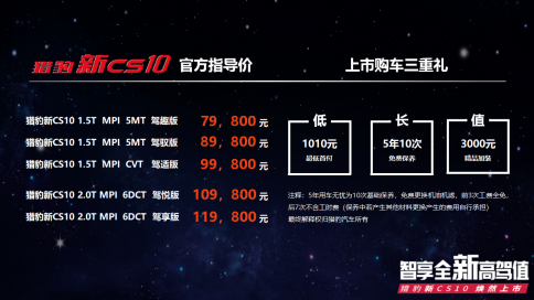 2019年4月13日,猎豹新CS10在杭州全国首发上市,共发布5款车型,指导价7.98万元起。秉持以消费者为中心的服务理念,猎豹新CS10在外观,智能配置、行车安全等方面升级多达37项,满足客户多元化的使用需求。