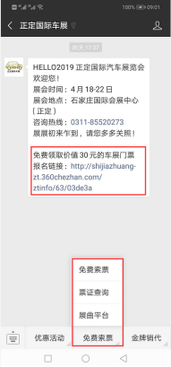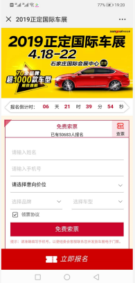 展会名称:2019正定国际汽车展览会暨新能源·智能汽车展|房车露营展 展会时间:4月18-22日 展会地点:石家庄国际会展中心(正定) 全品牌、大规模、高规格、多优惠的2019正定国际汽车展览会暨新能源智能汽车展(简称:正定国际车展),将于4月18-22日将在石家庄国际会展中心盛大举行。2019正定国际车展免费抢票通道将于4月17日17点准时关闭,还没有抢到门票的市民请抓紧时间啦。届时,车展现场票务微信购票25元/张,纸质售票30元/张,现关注【正定国际车展】微信公众号即刻抢票,错过就真的没有喽! 如何索票 关注“正定国际车展”微信公众号,选择“免费索票”,输入相关信息即可免费获取价值30元的车展门票;或点击自动回复报名链接进行索票。 票证查询 关注“正定国际车展”微信公众号,点击“免费索票”选择“票证查询”,输入相关信息,即可查票。 本届车展参展品牌涉及德系、日系、美系、法系、英系、韩系及自主品牌,涵盖了高级房车、新能源及智能汽车、平行进口,MPV、SUV、轿车等多款车型,打造华北汽车精品派对,全面满足广大车友赏车、购车的需求。 参展品牌大曝光 劳斯莱斯、宾利、玛莎拉蒂、奔驰、宝马、奥迪、林肯、路虎、红旗、上汽大众、东风日产、东风悦达起亚、广汽本田、一汽丰田、一汽大众、长安马自达、北京现代、别克、雪佛兰、广汽三菱、江铃福特、东风标致、东风雪铁龙、江西五十铃、吉利、传祺、荣威、MG、猎豹、中国一汽、一汽奔腾、宝骏、大乘、东风风神、东风风光、凯翼等。 新能源品牌:特斯拉、大众新能源、江淮新能源、长安新能源、上汽新能源、北汽新能源、哪吒汽车、众泰新能源等。 房车品牌:凯伦宾威、大通、爱旅、顺之旅、诺优、华晨、览众、郑州鑫源、七狼、江铃、旌航、卫航、法美瑞、亚特、艾威、华旅、星旺、七色鹿房车、微家车、蜗途、飞花、爱旅途、小蝌蚪、纵情山水房车俱乐部、御泰、威士捷、澳洲帝盛、龙城兄弟等。 其他,改装车、特价车、石家庄市总工会、农行汽车节、三博口腔、东明家居、进口红酒区、休闲娱乐区等。(以现场参展品牌为准) 签到礼 所有观众持车展门票到现场即可领取精美签到礼一份 购车礼 购车即可抽取万元家电(空调、冰箱、电视等),中奖率100% 抽奖礼 所有观众凭门票有机会抽取价值百元的进口红酒一瓶 品牌优惠 特价购车 特斯拉最高优惠15万元,大众途锐优惠14.78万元,奔驰Metris优惠13.8万元,奔驰GLE轿跑SUV最高优惠6.98万元,亚特房车优惠10万元,卫航房车优惠7万元,艾威国际房车优惠10万元,上汽大众最高优惠5万元,江铃福特优惠7.3万元,东风日产最高优惠4万元,北京现代最高优惠3.5万元,名爵优惠3万元,大乘汽车优惠2万元,众泰汽车最高优惠3万元,红旗最高优惠2.58万元,广汽本田最高优惠2.2万元,东风悦达起亚KX5优惠3.63万元,雪佛兰最高优惠4.79万元,吉利汽车最高优惠2.5万元,一汽奔腾优惠1.2万元,荣威优惠2.9万元,宝骏优惠1.12万元,江西五十铃最高优惠1.5万元(以上仅为部分品牌车型展示)。 免费送名爵6一年免费使用权 1、持车展门票并于4月21日到现场观展的客户均可参加; 2、现场扫描大屏幕上的二维码,关注后进入公众号,点击“签到抽奖”输入姓名和手机号进行电子签到; 3、大屏幕滚动抽取手机号码,中奖手机号码获得名爵6新车1年免费使用权。 官方认筹200抵1000 1、观众至组委会认筹处缴纳200元,得到一张1000元购车抵扣券(活动仅限参与认筹品牌,认筹张数以4S店为准) 2、购车时,观众出示抵扣券,直接抵扣车款。(仅限参与此活动品牌) 3、汽车销售与订车客户一同前往认筹处登记,客户凭订单可参与购车抽奖活动(需携带购车合同、付款凭证、身份证、认筹券,销售身份证、名片)。 4、当天未订车成功的客户,可至认筹处现场退回200元认筹金。 精彩活动 汽车PK 55吨重坦克 等你来挑战;领门票 抽红酒 赢免费酒庄游;河北国际汽车模特大赛;河北国际少儿时装周;亲子嘉年华、蝴蝶展、3D立体画,拍汽车 赢大奖 车展摄影大赛;买车,找他(她)很放心,谁是华北金牌销代,让我们拭目以待! 2019正定国际车展,全球汽车品牌的汇集地,联动厂家和区域的大型降价促销,河北省最大规模的汽车展出盛会。买车大优惠、逛展有好礼!更多好吃、好看、好玩的车展活动等你来发现。 2019正定国际汽车展览会 暨新能源·智能汽车展|房车露营展 时间:2019年4月18日-22日 地点:石家庄国际会展中心(正定) 官方微博:@正定国际车展 官方微信:正定国际车展 正定国际车展车友群:865378258 正定国际车展摄影群:774079659 展会合作联系:胡女士 13545079601 官方微信 |