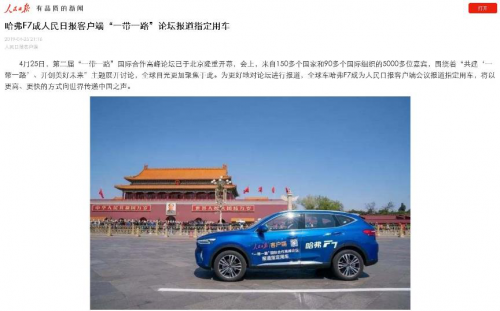 4月25至27日,第二届“一带一路”国际合作高峰论坛在京举行。这一重大历史盛会的再次来临,赢得国内外的高度关注与广泛赞誉,吸引了4100多名中外媒体记者用各种形式报道论坛盛况,让全球目光再次聚焦中国。 值得一提的是,哈弗SUV品牌掌门人、长城汽车董事长魏建军,作为中国品牌汽车的领军人物之一,受邀出席本届“一带一路”国际合作高峰论坛企业家大会。他以哈弗SUV所积累的丰富经验,为中国汽车品牌应对变革、实现超车提供了前瞻的思路与模式,为中国车企“走出去”探索更多可能,因而也获得了中外媒体的高度关注。而全球车哈弗F7也作为人民日报客户端“一带一路”国际合作高峰论坛报道指定用车成为论坛现场一道亮丽的风景,彰显了中国品牌的力量。
