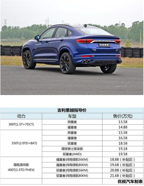 | 2019年5月10日,吉利旗下全新SUV星越正式上市,星越作为吉利品牌的旗舰级SUV,它也是吉利品牌的首款轿跑SUV,自亮相以来备受关注。新车共推出2.0TD+8AT(350T)、1.5TD+48V(300T)轻混、1.5TD插混(400T)3种动力共11个配置,指导价区间为13.58-21.68万元。汽油版、轻混版、插混版都到齐了。目前,吉利星越同时在线上与线下经销商销售。 |