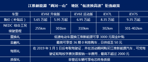 为了更好的普及新能源汽车,倡导绿色安全出行,江淮新能源近期面向“两河一山”(山东、河南、河北)地区的低速电动车主狂撒亿元红包,开展低速电动车置换专项活动,置换礼、金融礼、驾照礼、质保礼四重大礼助力低速电动车主品质升级、舒适升级、安全升级,安心又省钱!详情如下表所示。 此次活动钜惠政策可谓是相当给力,为低速电动车主购车提供了巨大实惠,充分体现出江淮新能源的满满诚意。