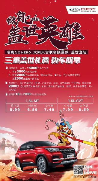 随着消费水平逐步升级,拥有车的家庭越来越来多,中国也早已成为全球最大的汽车消费市场,虽然一千个读者就有一千个哈姆雷特,一千个人就有一千条好车标准。可对于广大潜在车主来说,有一条标准不容忽视——颜值,开到路上,既要有第一眼爆点,又要足够耐看,打造长情记忆。 瑞虎5x HERO也正是奇瑞汽车基于对年轻人洞察,针对活出自我,敢于不同的新青年,联手经典动画《大闹天宫》共同打造的“新潮流 智趣SUV”,全系产品搭载满足国VI标准1.5L发动机,并提供双色潮流车身供选配,带你重温少年英雄梦,值得一提的是,瑞虎5箱HERO全系5.99万元起,潮惠价助你轻松成为朋友圈最吸睛潮酷达人。