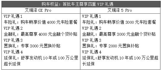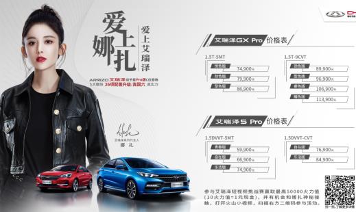 2019年6月25日,奇瑞汽车旗下的艾瑞泽双子星Pro版正式上市发售,青年演员娜扎出任艾瑞泽系列代言人。满足国六排放,两款车型进行了5大模块、26项升级,售价区间为5.99-11.39万元。同时,奇瑞汽车还针对艾瑞泽双子星Pro版提供多重购车权益,为用户带来更丰富、更高价值的回馈。 购车权益:首批车主尊享四重VIP礼遇 艾瑞泽GX Pro艾瑞泽5 Pro VIP礼遇1 车险礼:购车畅享价值4000元车险套餐 VIP礼遇2 金融礼:最高尊享4000元金融个贷补贴 VIP礼遇3 置换礼:专享3000元置换补贴 VIP礼遇4 延保礼:舒享发动机10年或100万公里超长延保VIP礼遇1 车险礼:购车畅享价值3000元车险套餐 VIP礼遇2 金融礼:最高尊享3000元金融个贷补贴 VIP礼遇3 置换礼:专享2000元置换补贴 VIP礼遇4 延保礼:舒享发动机10年或100万公里超长延保 极尽出色 14项配置升级 艾瑞泽GX Pro焕新登场 “9速高性能智慧座驾”艾瑞泽GX Pro在外观、内饰、智能化配置、舒适性配置等方面进行了14项的进化升级。内外兼修,型速兼备,焕新而来的艾瑞泽GX Pro为用户打造了更为理想化的优越驾乘体验。 澎湃启程 率先满足国六排放 当前,节能环保已经成为汽车行业发展和汽车消费的趋势。积极响应国家政策,奇瑞汽车加快推进驱动系统的高效升级,推出满足国六排放的艾瑞泽GX Pro。 搭载1.5T+9CVT黄金动力搭档,艾瑞泽GX Pro的最大功率为115kW,最大扭矩230N?m。实现燃油经济性与动力性能与的完美平衡,艾瑞泽GX整体的动力输出高效、充沛,加速响应及换挡十分的快速、灵敏,0-60km/h加速时间仅需4秒,百公里加速则为9秒。再次澎湃启程,艾瑞泽GX Pro继续以令人心跳加速的冲刺表达自我,为用户带来酣畅淋漓的随心驾控。 越级升级 让驾乘更舒心、更安心 除了排放更为环保外,艾瑞泽GX Pro对整车的舒适、智能、安全等方面的配置水平进行了越级式的升级。 艾瑞泽GX Pro全系标配TPMS胎压监测系统,可以实时监测胎压,并显示胎压情况,保障消费者的行驶安全。此外,艾瑞泽GX Pro的中高配车型还增加了驾驶席座椅电动6向调节、前排座椅电加热、AQS空气质量管理系统、自动空调等精良配置,并对“雄狮智云”智能网联系统进行了再升级,让用户尽享舒适、便利驾乘。新增的高清集成式行车记录仪,不仅能够清晰记录汽车行驶全过程,还能一键拍照,轻松写意沿途风景让,使得用户的旅程更随心、更安心。 玩转型色 唤醒感官新体验 采用运动美学设计理念,艾瑞泽GX Pro在外观以及内饰的设计方面继续保持着鲜明的年轻感与型格魅力,新增的能量锋厉LED前大灯使得整体的运动气质更为浓烈,动静之间,锋芒毕露。在车身颜色方面,艾瑞泽GX Pro新增了高级有格调的钛金灰,整车的清漆工艺也进行了升级。 真国六·真实力 艾瑞泽5 Pro 12项配置升级 品质首选 三年揽获40万用户,作为艾瑞泽系的经典车型,奇瑞汽车同样对全新艾瑞泽5进行了产品力的全面提升,经过5大模块、12项升级,推出了满足国六排放的艾瑞泽5 Pro。造型设计、安全配置、智能科技等方面均更进一步,“新生代品质首选”艾瑞泽5 Pro继续向高品质家轿进化。 安全先行 主动被动安全全面升级 为安全层层设线,前行才能不受限。安全性能方面,艾瑞泽5 Pro增加了集成式行车记录、EPB电子驻车制动系统以及AUTOHOLD自动驻车系统等行车辅助配置,并实现了TPMS直接式胎压监测系统的全系标配,满足用户的各类安全辅助需求。此外,在超高强度一体化笼式车身的基础上,艾瑞泽5 Pro增加了前排侧气囊及贯穿式侧气帘,更大程度地降低人员在交通事故中的受伤情况。将被动安全及主动安全完美结合,艾瑞泽Pro 为用户提供了全方位的壁垒式安全防护。 雄狮智云升级 解锁潮酷用车新姿势 在智能科技配置方面,除了原有的AI智云管家、AI增强型自然语音交互,艾瑞泽5 Pro还新增了潮酷感应式智能手环钥匙。该手环可以实现无钥匙进入、启动车辆、遥控降窗以及开启尾门等功能,兼具实用性和高颜值。此外,智能钥匙手环还具备了一系列运动手环的实用功能,可用于卡路里监测、步数统计、心率监测以及闹钟提醒等,贴心、高能,轻松焕新智能生活新体验。 不止于此,艾瑞泽5 Pro在外观、内饰、舒适性等方面均进行了升级,全系标配17吋超大暴雪亮面轮辋、真皮多功能高质感方向盘以及全包覆式人体工程学皮座椅,并且新增了主驾驶席座椅6向电动调节,为用户提供更为便利、个性化的舒适乘坐。 继承经典 安心、舒心的品质之选 由融合了捷豹路虎技术的专业轿车平台M1X打造,艾瑞泽5 Pro继承了老款优越的品质基因并承诺发动机十年百万公里超长延保,让消费放心买车、更安心用车。 此外,艾瑞泽5 Pro保留了全新艾瑞泽5颇受好评的空间设计,长宽高分别为4572mm/1825mm/1482mm,轴距达到2670mm,优越的车身宽度及轴距为用户带来十分宽敞舒适的超大空间,配合配合有质感、有格调的科技内饰设计,让用户享受到极致的高品质驾乘体验。 多元化营销 引爆艾瑞泽系年轻能量 在两款实力车型上市之际,奇瑞汽车正式官宣娜扎出任艾瑞泽系列代言人。作为一位90后青年演员,娜扎始终挑战多面的荧幕形象,其以出色实力探索无限可能的年轻态度,恰好与艾瑞泽系“年轻”“出色”的精神内核完美契合。 选择娜扎作为艾瑞泽代言人,不仅是奇瑞艾瑞泽生活态度的彰显,更展示出奇瑞汽车持续践行品牌年轻化战略的决心。在产品年轻化之外,致力