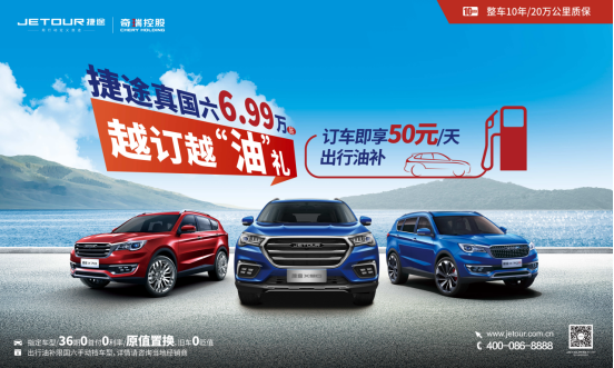 为进一步满足广大用户对捷途国六手动挡车型的需求,日前,捷途正式推出了“真国六6.99万起,越订越‘油’礼”的钜惠活动。凡在7月20日—8月17日期间订购捷途X70、X70S、X90等产品手动挡车型,自订车之日起至订购车辆创单后第七日止,每天可享受汽油补贴 50 元,至高可享2000元的补贴。