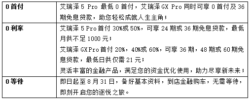 夏日热浪来袭,奇瑞艾瑞泽夏日购车风暴清凉价到!为回馈广大消费者一直以来的支持与关注,更为帮助广大消费者轻松实现购车梦,奇瑞艾瑞泽特推出夏季购车福利活动。即日起至8月31日,购艾瑞泽GX Pro和艾瑞泽5 Pro全系产品均可享受0首付、0利率等多重金融购车方案。充分让利消费者,并覆盖每一个购车群体,奇瑞艾瑞泽系列将在这缤纷夏日再掀一场购车狂潮。 详细购车政策: 真国六、实福利。此次活动,艾瑞泽GX Pro及艾瑞泽5 Pro这两款明星车型均参与其中,用诚意满满的超值活动,让消费者轻松购爱车回家!即日起走进奇瑞汽车全国销售店,与我们共享惊喜福利! 9速高性能智慧座驾 艾瑞泽GX Pro轻松购 作为艾瑞泽系的当家小生,凭借着高颜智、高智能、高性能的优越产品力,艾瑞泽GX 自上市以来便备受关注。作为艾瑞泽GX的升级款车型,艾瑞泽GX Pro进行了5大模块、14项的配置升级,整体产品力及性价比得到了全面的提升。 满足国六排放标准,在动力方面,艾瑞泽GX Pro配备了1.5T+9CVT黄金动力搭档。实现燃油经济性与动力性能与的完美平衡,其最大功率为115kW,最大扭矩230N?m,百公里加速为9秒。除了排放更为环保外,艾瑞泽GX Pro对整车的智能、安全等方面的配置进行了越级式的升级。不仅新增了驾驶席座椅电动6向调节、前排座椅电加热、AQS空气质量管理系统等精良配置,还对“雄狮智云”智能网联系统进行了再升级,让用户尽享舒适、便利驾乘。 内外兼修,设计风格鲜明的艾瑞泽GX Pro还新增了能量锋厉LED前大灯,整体的运动气质更为浓烈。 增配不加价,这样一款本就诚意满满的升级产品,现在购买还可享受享受0首付、0利率等多重金融购车方案,超低的购车门槛让您轻轻松松便可加入艾瑞泽GX Pro的高能阵营。 艾瑞泽5 Pro 新生代品质首选 三年揽获40万用户,作为艾瑞泽系的经典车型,全新艾瑞泽5的升级版车型艾瑞泽5 Pro同样在此次的优惠活动之列。 经过5大模块、12项升级,艾瑞泽5 Pro在继承老款车型优越的品质基因及空间设计的同时,其造型设计、安全配置、智能科技等方面均更进一步,尤其是智能配置。不仅配备升级版的“雄狮智云”智能网联系统,艾瑞泽5 Pro还新增了潮酷感应式智能手环钥匙。集无钥匙进入、启动车辆、开启尾门以及卡路里监测、步数统计等诸多功能于一身,贴心、高能,让用户轻松解锁更为便捷、惬意的智能生活。 此外,艾瑞泽5 Pro还增配了主驾驶席座椅6向电动调节,EPB电子驻车制动系统以及AUTOHOLD自动驻车系统等行车辅助配置,并实现了TPMS直接式胎压监测系统以及真皮多功能高质感方向盘的全系标配,让用户的用车体验更舒适、更安全。 超高实力、超值优惠,“新生代品质之选”,艾瑞泽5 Pro等你来选购! 作为热度颇高的轿车系列,奇瑞艾瑞泽旗下的艾瑞泽GX Pro/艾瑞泽5Pro无论是动态的驾驶质感,还是独具型格的外观设计以及领先的智能配备都可谓是同级翘楚。这次活动在为消费者带来优质产品、品质服务的同时更带来诚挚的优惠,让更多人轻松将惬意行车生活立刻拥有在手。 这个热到爆炸的夏天,让艾瑞泽GX Pro/艾瑞泽5 Pro陪你躁起来吧! |