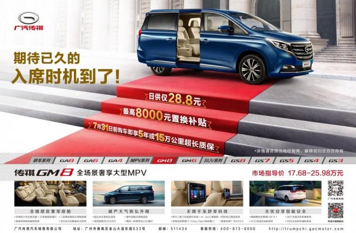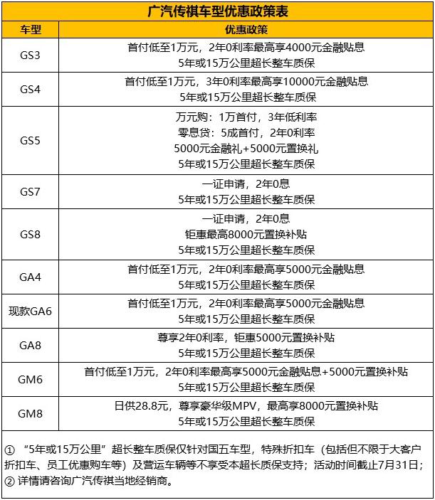 又是一个骄阳似火的暑期,又是一年一度的毕业季,“饱读万卷书”的毕业生们即将离开象牙塔迎接属于他们的“万里路”新征程。而此刻的你,是否也会忍不住追忆那个曾经年少的自己?是否也曾在苟且的都市忙碌中怀念青春的梦想?是否总会渴望来一场诗和远方的追寻之旅? 青春不散场,快乐再出发,如果你想去远方,我们给你放“价”。这个“价”期,广汽传祺11载感恩回馈,亿元豪礼钜献贴心为您,诚意满满!毕业经年的你,也能车行人生,重走青春。 亿元豪礼,“价”期钜惠 为感恩回馈广大消费者,广汽传祺携手SUV、MPV及轿车全系车型齐参与钜献回馈活动。活动期间,广汽传祺全系让利,献礼11周年,亿元豪礼等您拿!即日起走进广汽传祺全国销售店,总有一款适合您。 SUV车型作为广汽传祺的“高人气”产品,此次活动,多款SUV齐放“价”,可谓是诚意满满。 智联潮品SUV传祺GS3,凭借新锐动感的光影设计美学打造的潮流外观,搭载智慧传祺T-BOX车联网3.0,带给您触发智能生活掌控新风潮的酷炫感。现购买传祺GS3即可享受:首付低至1万元,2年0利率最高享4000元金融贴息,以及5年或15万公里超长整车质保优惠政策。 祺云概念智慧SUV传祺GS4,连续两年夺得J.D. Power中国新车质量研究(IQS)中国品牌紧凑型SUV新车质量冠军,斩获中国品牌紧凑型SUV保值率第一荣耀。兼具祺云概念智联“行车大脑”和国际风范设计高颜造型的传祺GS4值得您拥有。现购买传祺GS4即可享受:首付低至1万元,3年0利率最高享10000元金融贴息,以及5年或15万公里超长整车质保优惠政策。 新世代驾享先锋SUV传祺GS5,将驾控性能和乘坐享受高度融合,搭载传祺第3代270T发动机,Ti-Power 3.0高燃动力,在实现高效动力与燃油经济性完美平衡的同时更是让驾乘的愉悦发挥得淋漓尽致。现购买传祺GS5,即可享受: 1万首付,3年低利率的万元购,5成首付,2年0利率的零息贷,以及5000元金融礼+5000元置换礼,还有5年或15万公里超长整车质保优惠政策。 传祺GM6和GM8组建的“MPV家族”可谓是MPV 市场中难得一见的“双子星”组合,其凭借出众的实力深受追捧,一度掀起了时尚MPV新风潮。 全能宽享MPV传祺GM6尊崇纵享生活N次方,用热情拥抱生活。自今年初上市以来,凭借“锐动大气外观、越级宽享空间、祺云AI智慧互联、舒适安全畅行”等出众的全能实力倍受消费者追捧,位于MPV 销量榜前列。现购买传祺GM6,即可享受:首付低至1万元,2年0利率最高享5000元金融贴息+5000元置换补贴,以及5年或15万公里超长整车质保优惠政策。 全场景奢享大型MPV传祺 GM8,是广汽传祺历经多年精心打磨的力作。其凭借 “威严大气恢弘外观、全维感官奢享座舱、无微不至舒享科技、无忧安享智能安全”四大核心价值,颠覆传统商务,专为新一代商务精英量身定制,连续数月蝉联中国品牌高端MPV销量冠军。现购买传祺GM8,即可享受:日供28.8元,尊享豪华级MPV,最高享8000元置换补贴,以及5年或15万公里超长整车质保优惠政策。 除了以上几款重磅车型外,品质魅力家轿传祺GA4、新时代创行者豪华座驾传祺GA8、都市领秀大5座SUV传祺GS7和旗舰级豪华大7座SUV传祺GS8等车型同样也钜惠回馈广大消费者。不管选购哪一款,总有高额优惠等您拿! 其中,“5年或15万公里”超长整车质保仅针对国五车型,特殊折扣车(包括但不限于大客户折扣车、员工优惠购车等)及营运车辆等不享受本超长质保支持。详情请见下表。 高端质造,“驾”趣无穷 广汽传祺能赢得广大消费者的美誉口碑,离不开其十年如一,志在用品质为消费者塑造驾驶乐趣的伟大追求。十年来,广汽传祺全面布局产品矩阵,满足多元化的市场需求,六度蝉联J.D. Power中国新车质量研究(IQS)报告中国品牌第一,入选Interbrand 2018中国最佳品牌50强,彰显了中国汽车领导品牌硬核实力。 6 月 28 日,广汽乘用车宜昌工厂竣工,这标志着广汽传祺在全方位打造世界级造车 体系的发展道路上,又迈出了重要一步。作为布局华中的智能制造标杆工厂,广汽传祺宜 昌工厂充分贯彻“工业 4.0”理念,并将生产自动化、信息数字化、管理智能化、智造生 态化四大特征的创新广汽生产方式(GPS 3.0)落到实处,为广汽传祺铸就了“智能制造” 的新发展引擎。 对卓越品质坚守的同时,广汽传祺还用心满足了消费者对驾驶乐趣的追求。智慧互联的科技配置,舒适宽裕的驾乘空间以及时尚大气的外观设计,广汽传祺正是以技术创新和产品升级想消费者之所想,忧消费者之所忧,精心为其打造出行“驾”趣。 无忧尊享,服务“加”码 在汽车消费升级的时代,广汽传祺坚持“用户思维”,特为消费者打造更专业、更贴心的越级服务。 在不改变店面原有结构和布局的前提下,全面升级全国近500家特约店:打造 4S 店“透明车间”,看得见的专业让消费者更放心;推出高效率又贴心的 “60 分钟双人快保”和“钣喷两小时快修”服务,满足消费者对“快速高效”的服务期望。进行全面改造升级后的广汽传祺全新特约店品牌标识突出,温馨时尚,内装和布局更趋精细化、科技化、时尚化。 此外,广汽传祺还率先推出全行业首创的维修代步车尊享服务,目前,全国8000台维修代步车已就位,平均每家4S店都备有超过16台。广汽传祺切实做到了全覆盖,真服务,用心解决用户车辆维修期间的出行难题。服务“加”码,实属您的优选。 有车相随,活出自在人生,广汽传祺 “11载感恩回馈,亿元豪礼钜